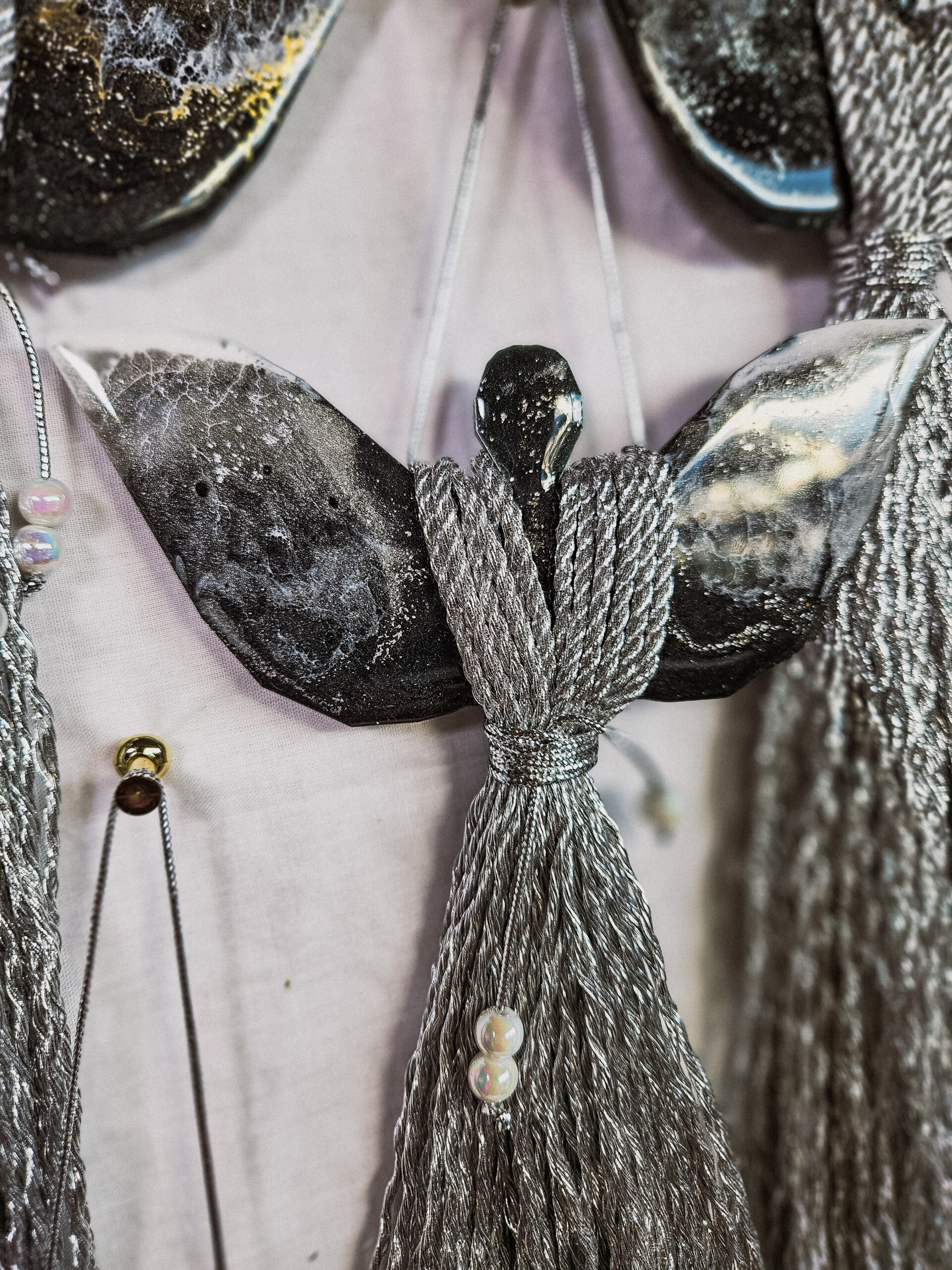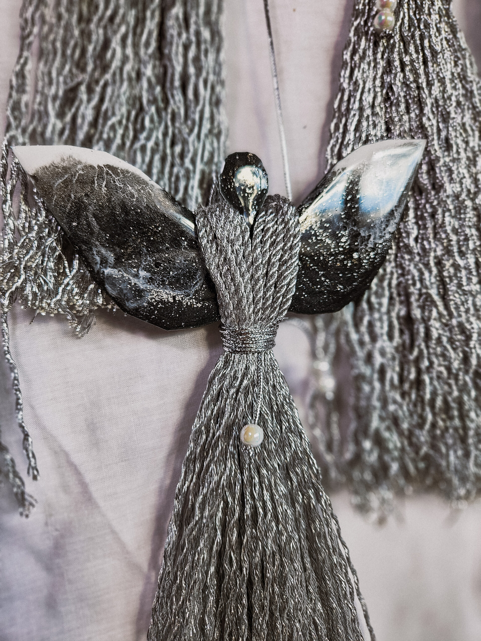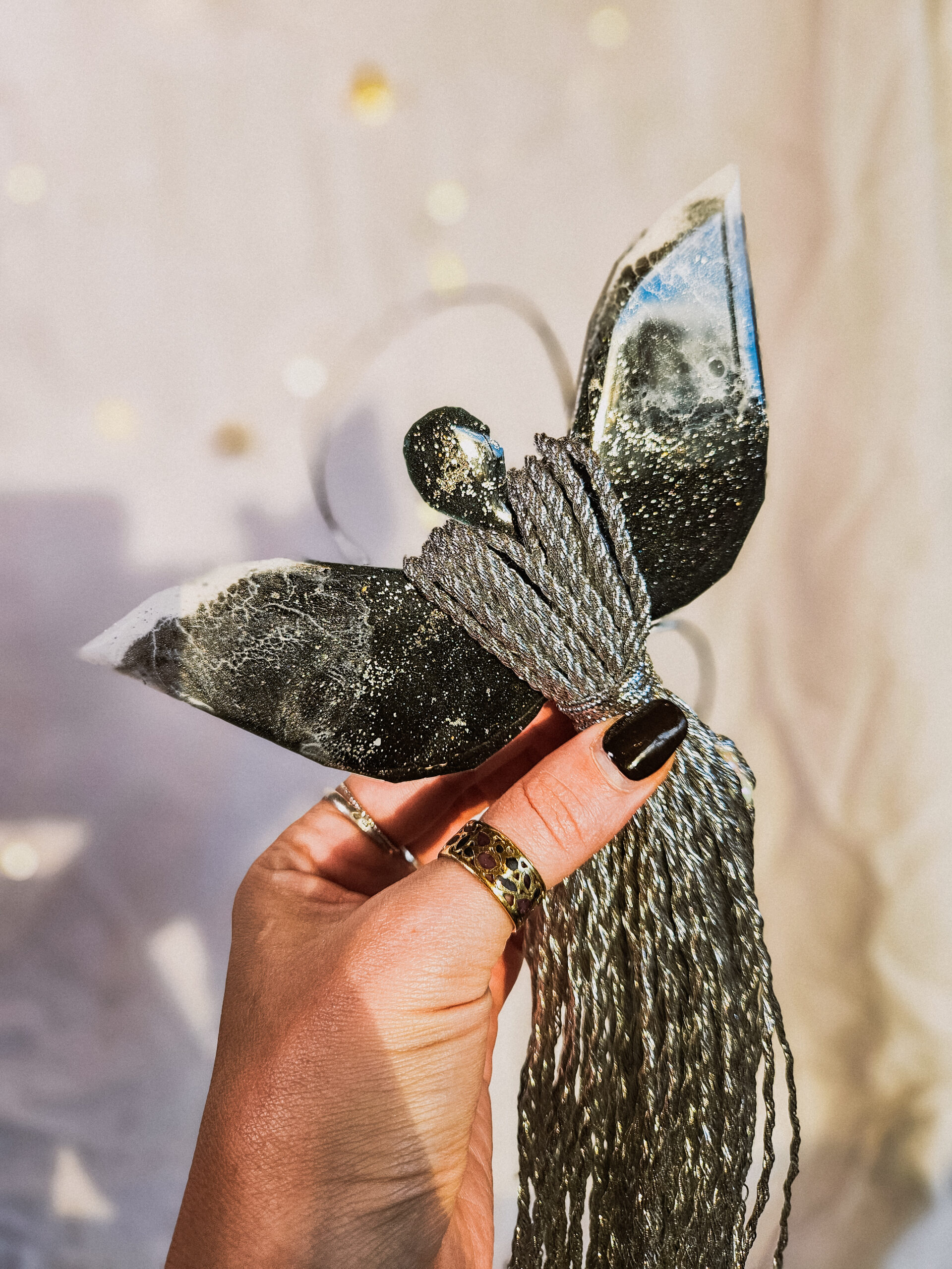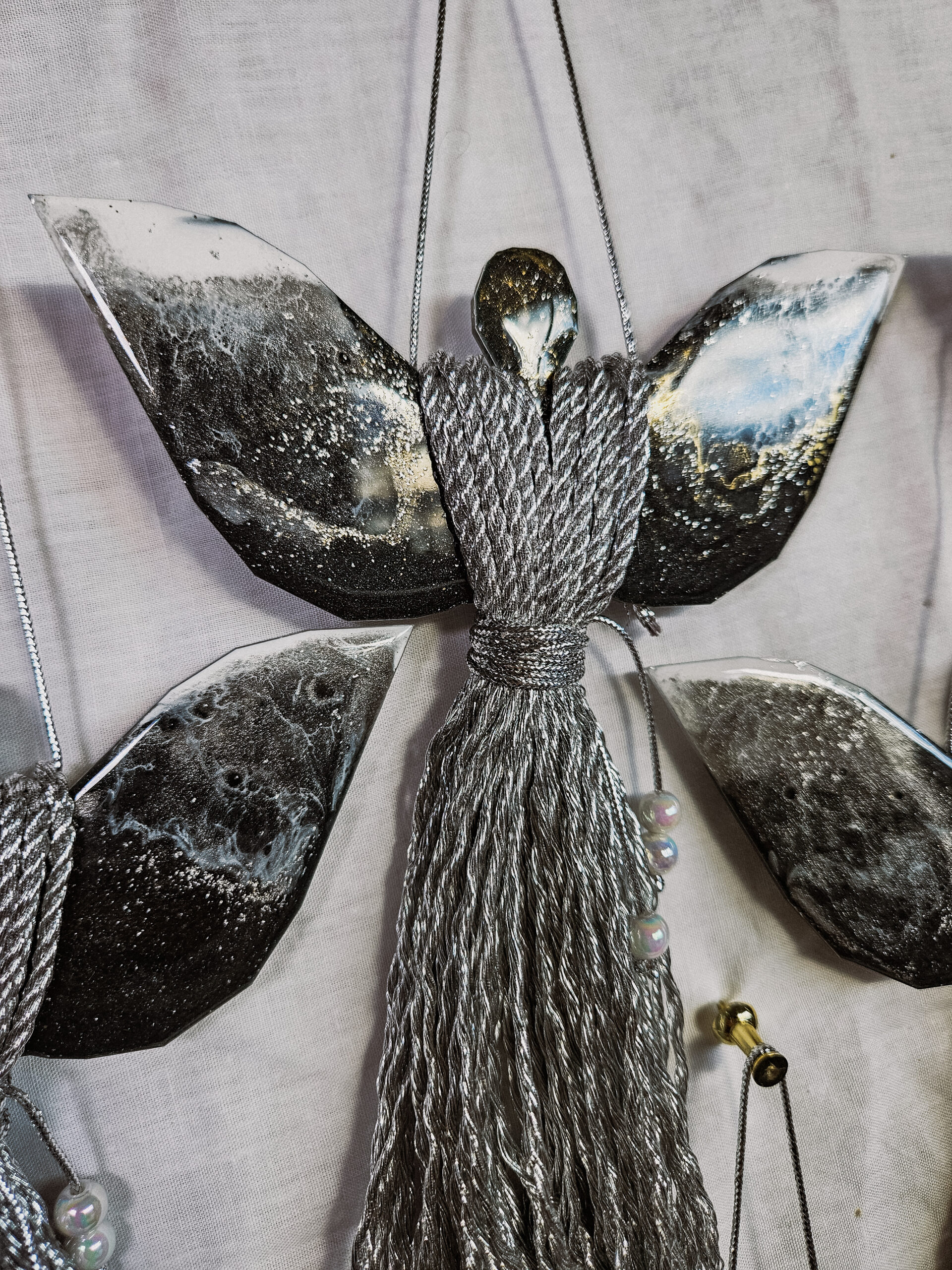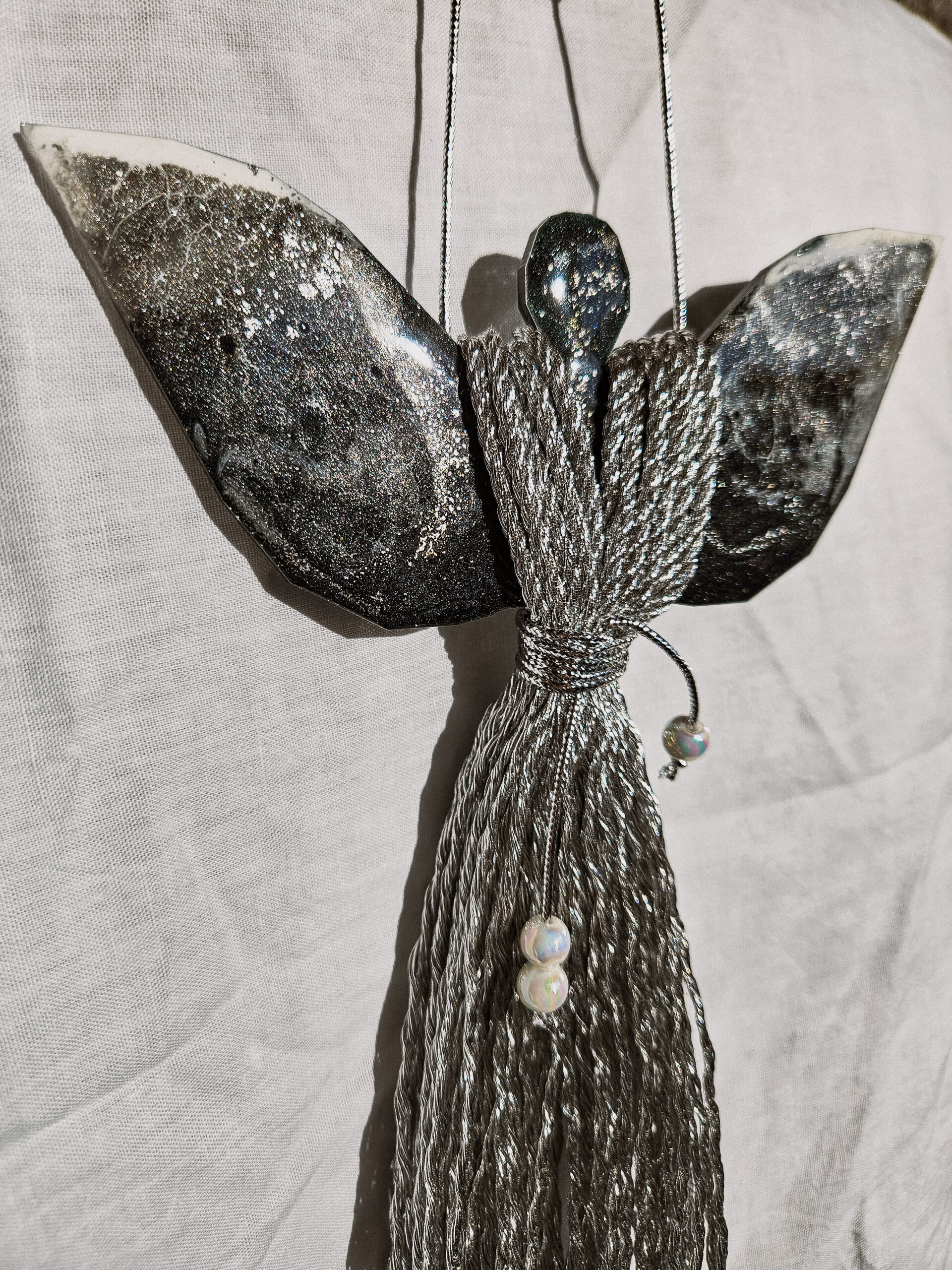 Cześć, dzień dobry! Przedstawiam Ci ręcznie wykonanego Anioła, który wniesie do Twojego domu magię, ciepło i odrobinę świątecznego blasku. Skrzydła Anioła wykonane są z żywicy, która pięknie się mieni – w tej wersji w odcieniach czerni z dodatkiem bieli i srebra, natomiast sukienka powstała z srebrnego, mieniącego się sznurka. Całość zdobi błyszczący sznureczek z koralikami w talii, który dodaje subtelnej elegancji.