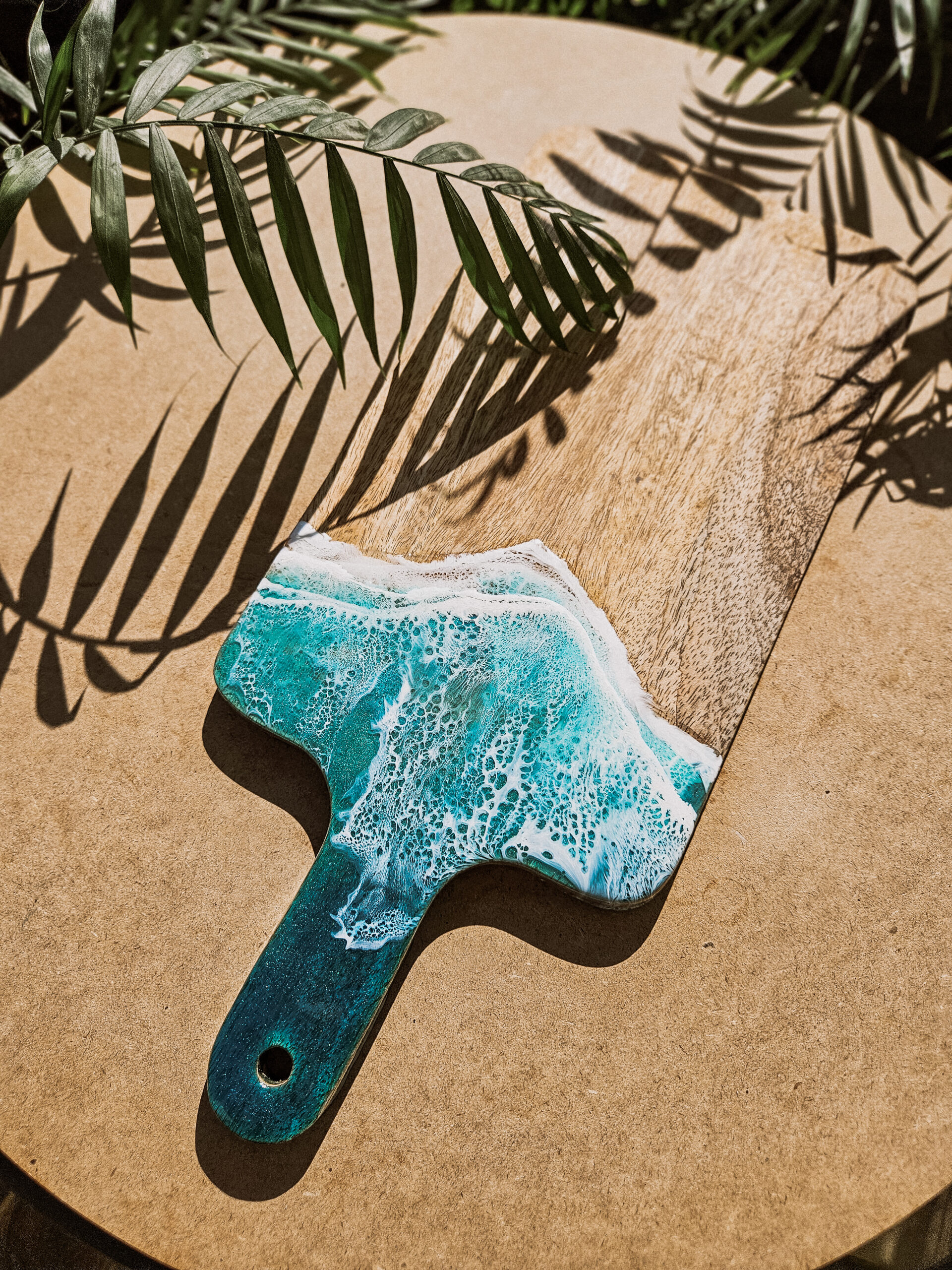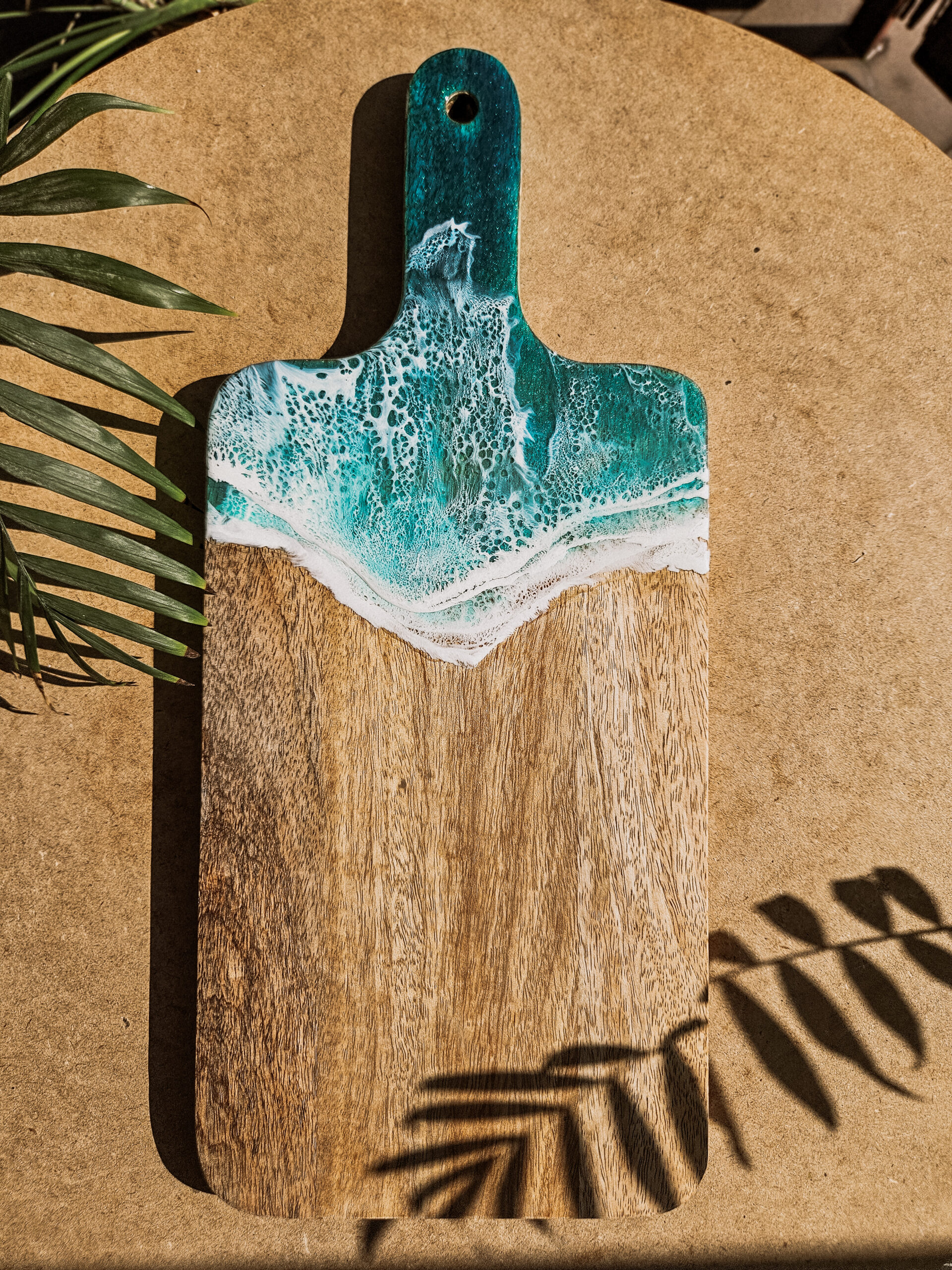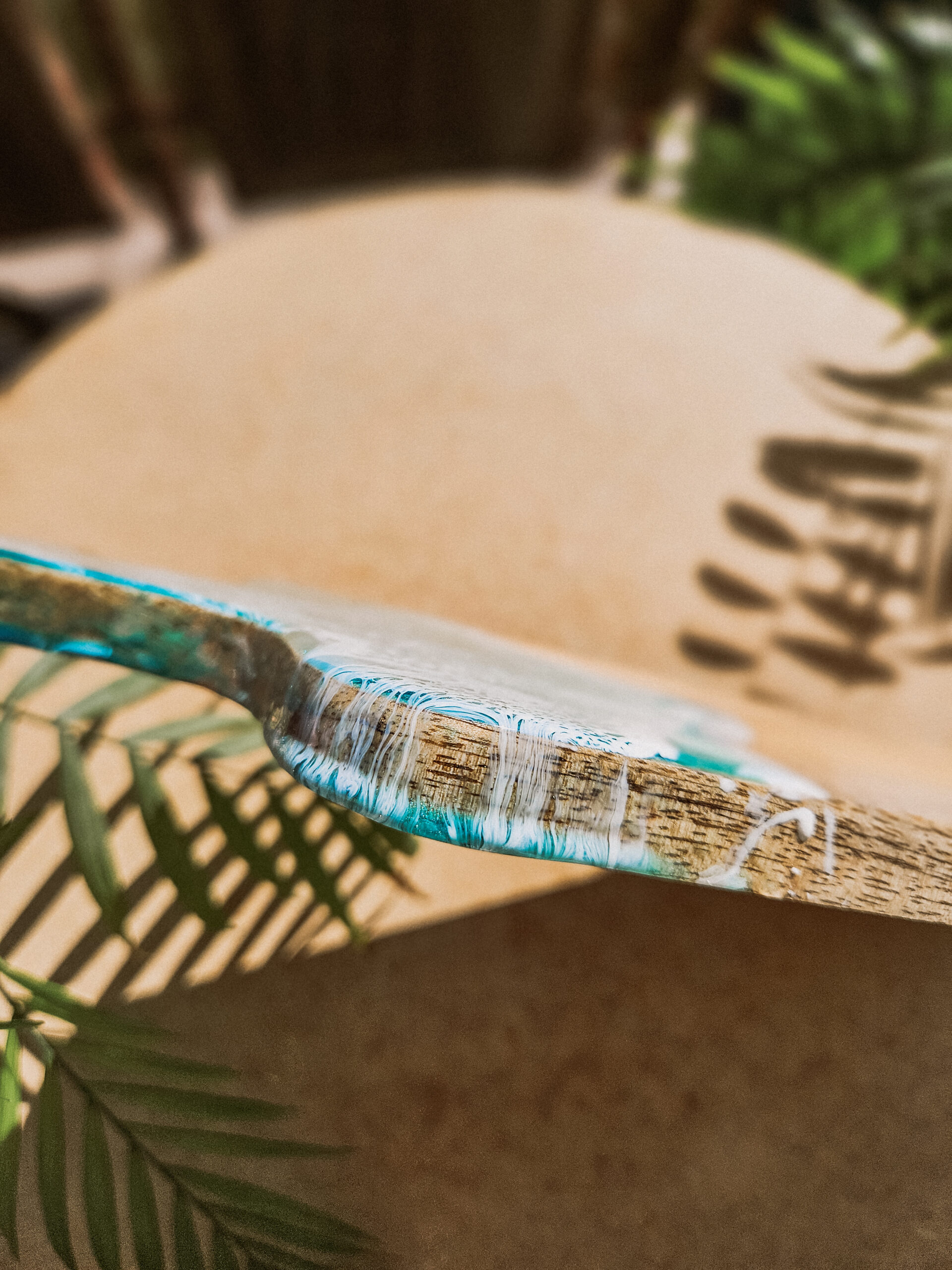 Odkryj tropikalny urok deski wykonanej z drewna mango, która łączy w sobie naturalne piękno z artystycznym wykończeniem żywicą, która przypomina morskie fale.