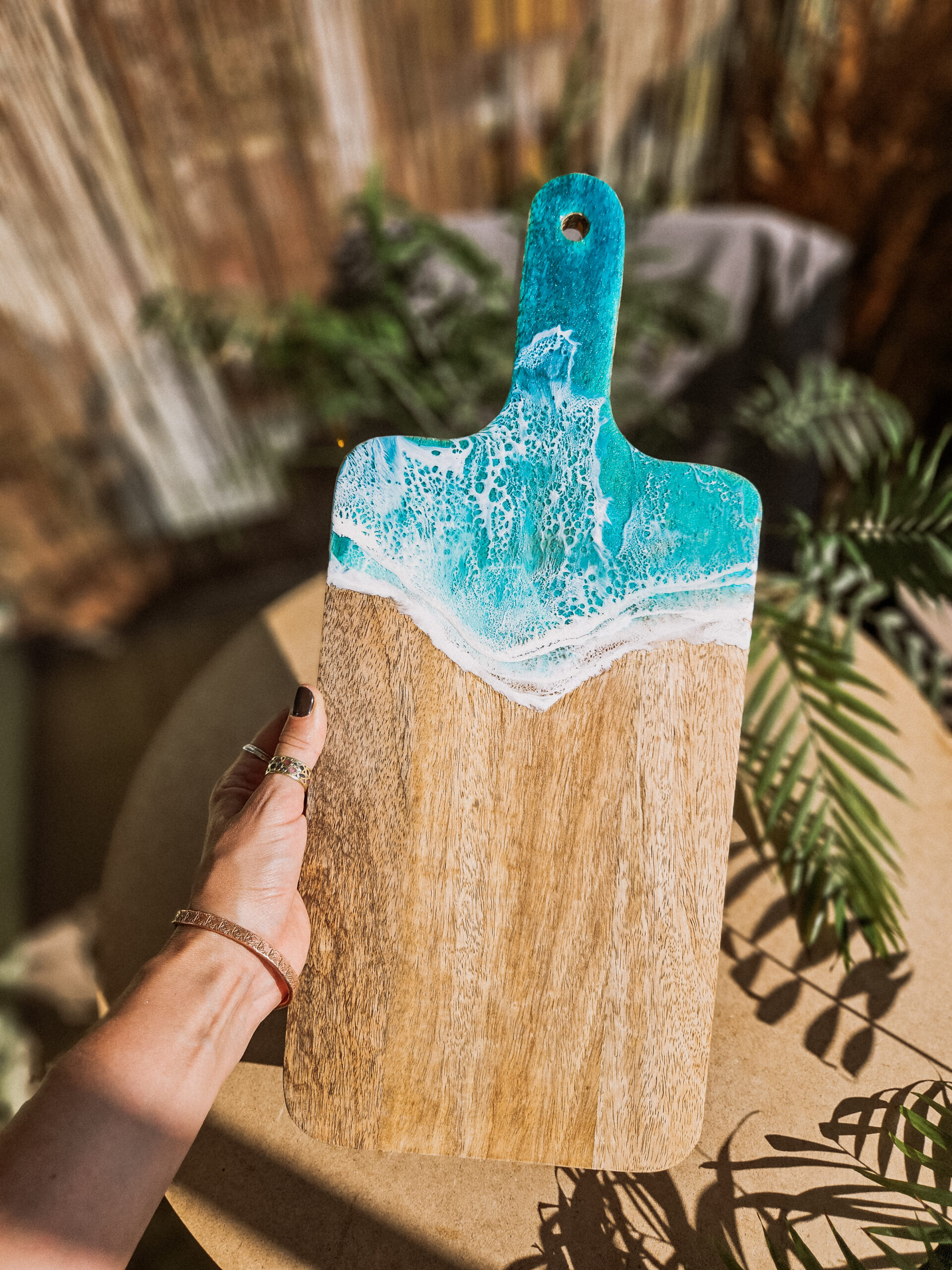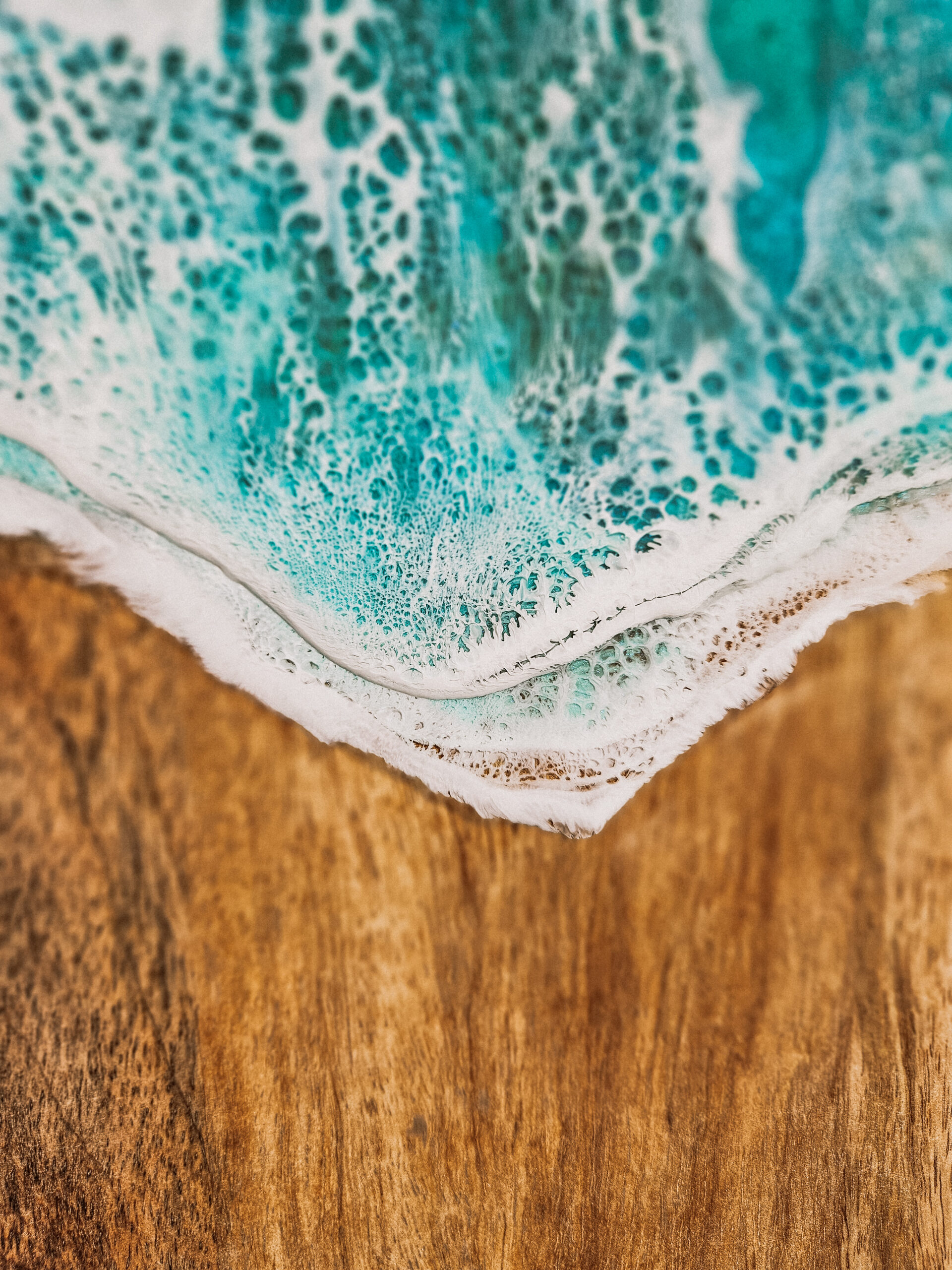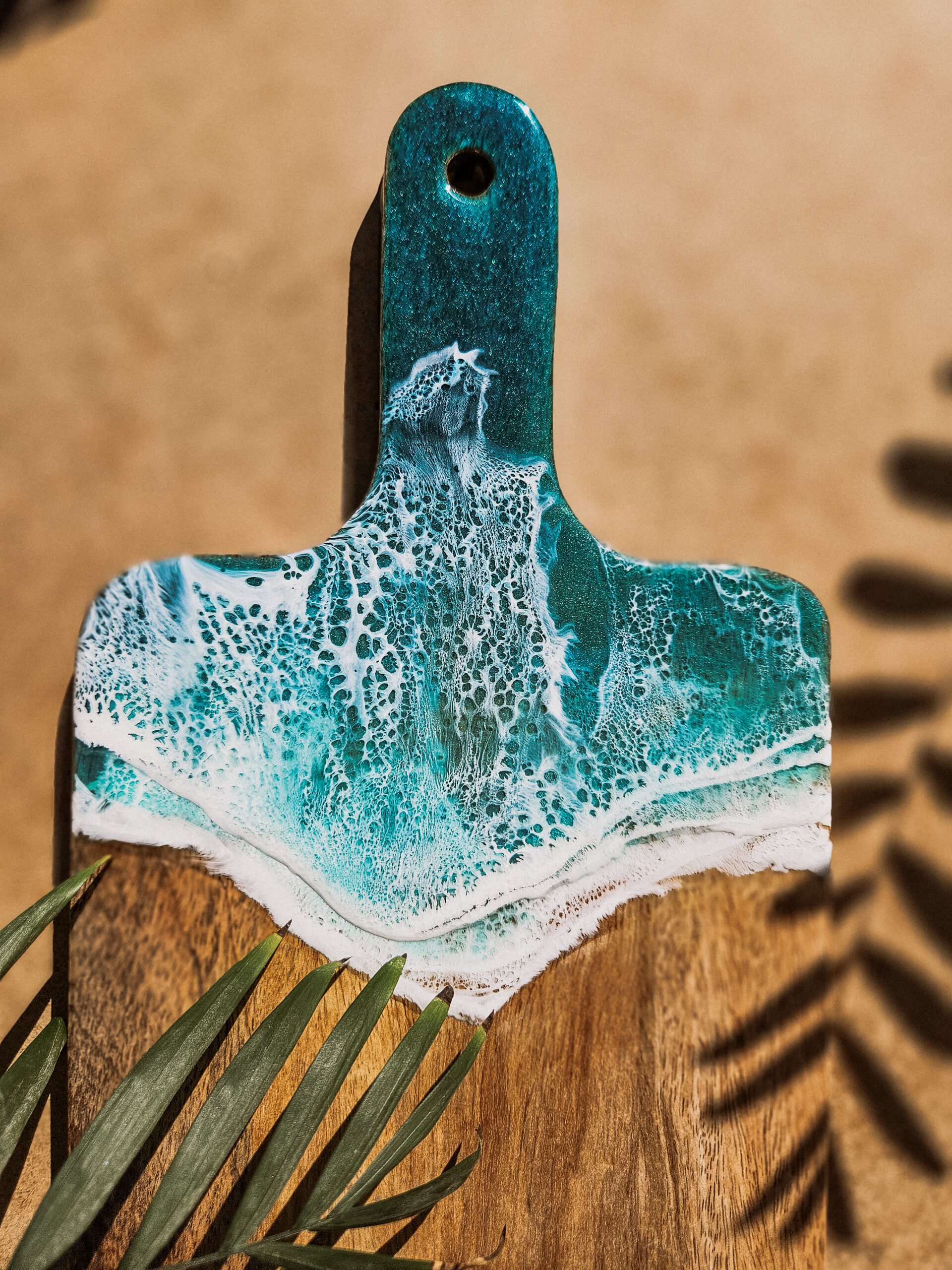 Odkryj tropikalny urok deski wykonanej z drewna mango, która łączy w sobie naturalne piękno z artystycznym wykończeniem żywicą, która przypomina morskie fale.