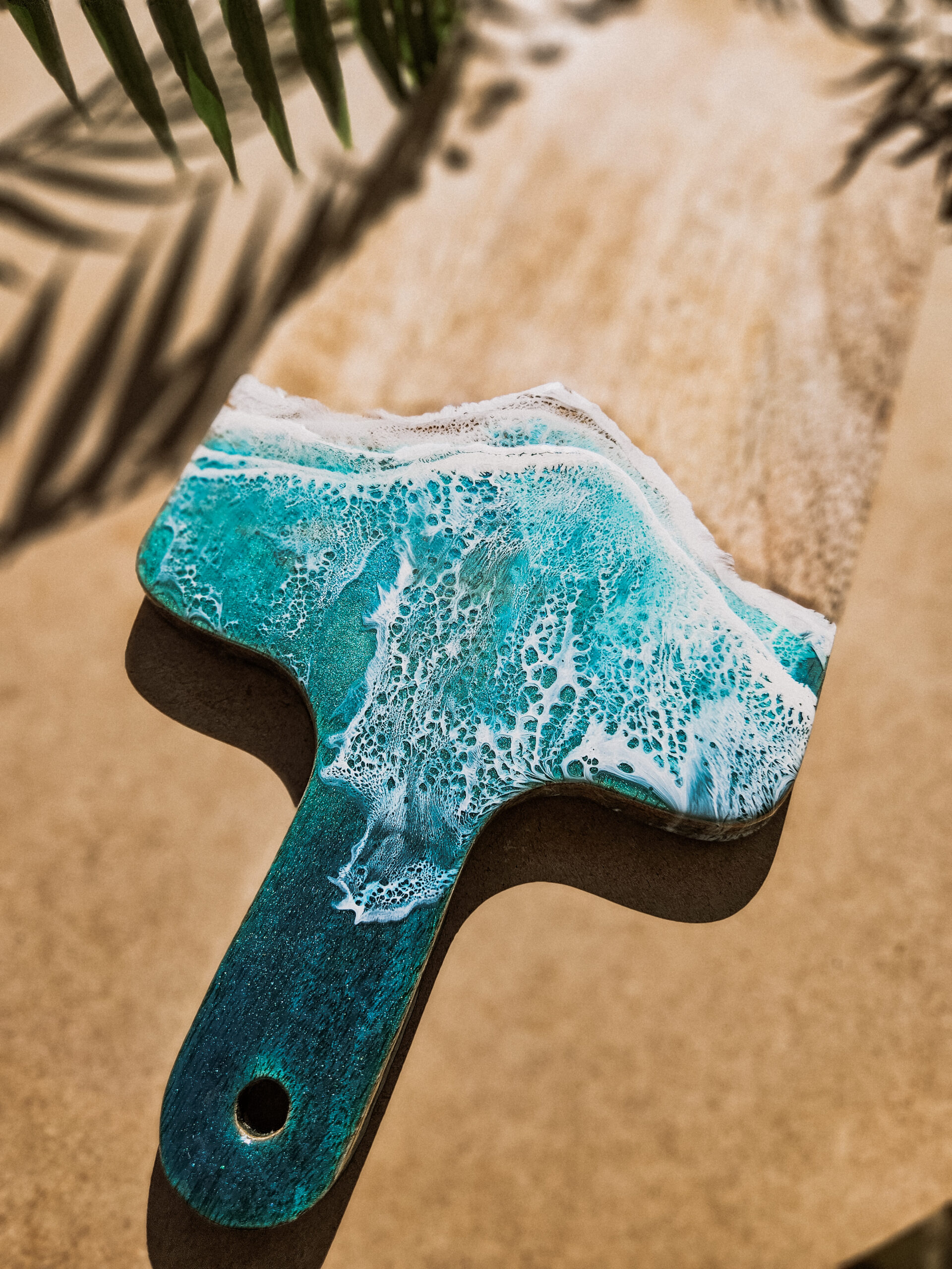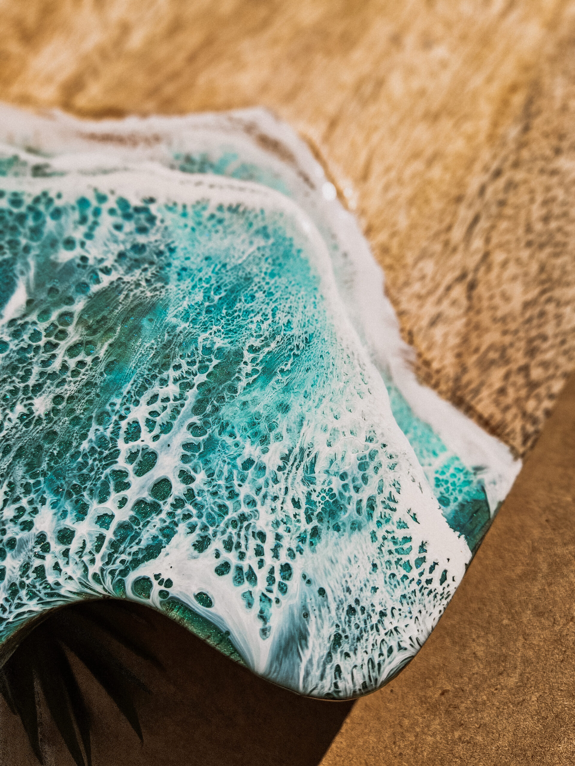 Żywica epoksydowa, nałożona na powierzchnię deski, została wylana tak, aby przypominała naturalne morskie fale. Dzięki specjalnej technice artystycznej, fale te wyglądają niezwykle realistycznie, przyciągając wzrok i wprowadzając relaksującą, morską atmosferę do Twojego domu.