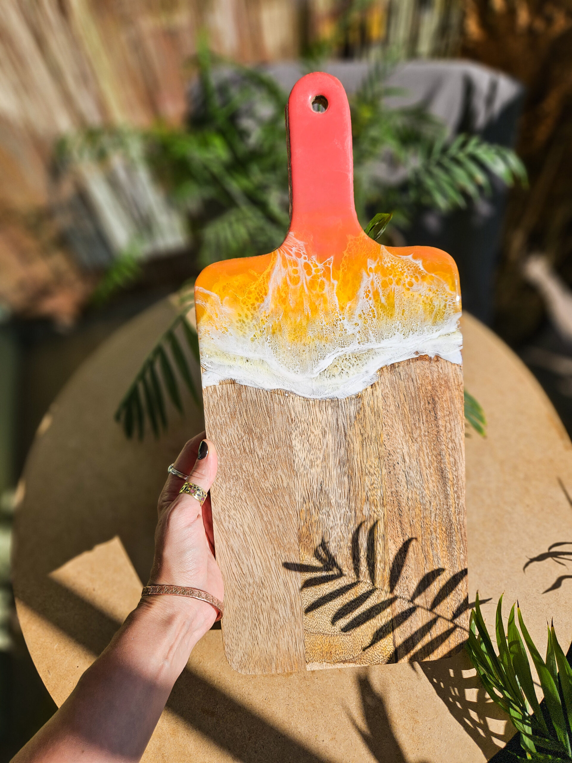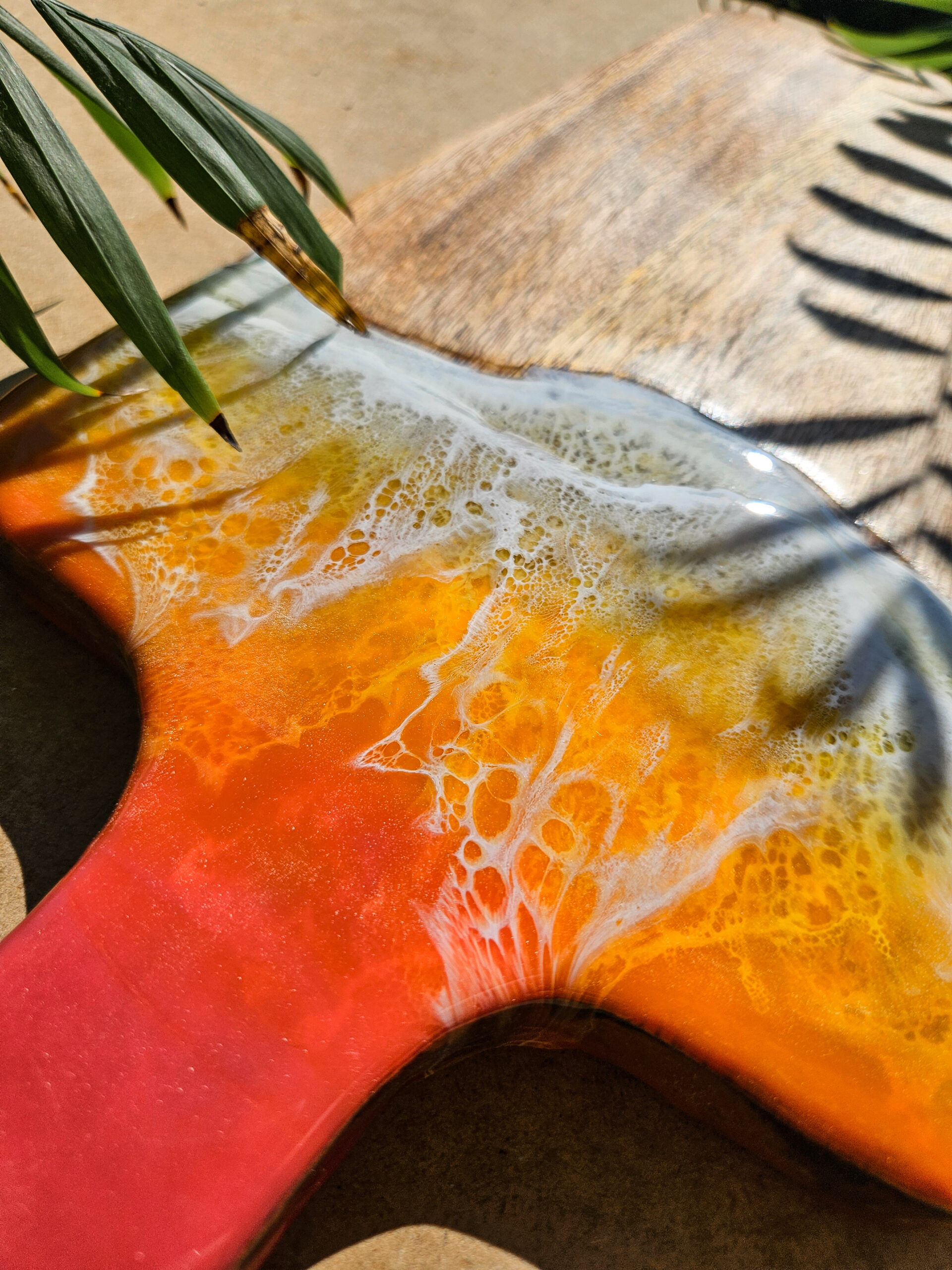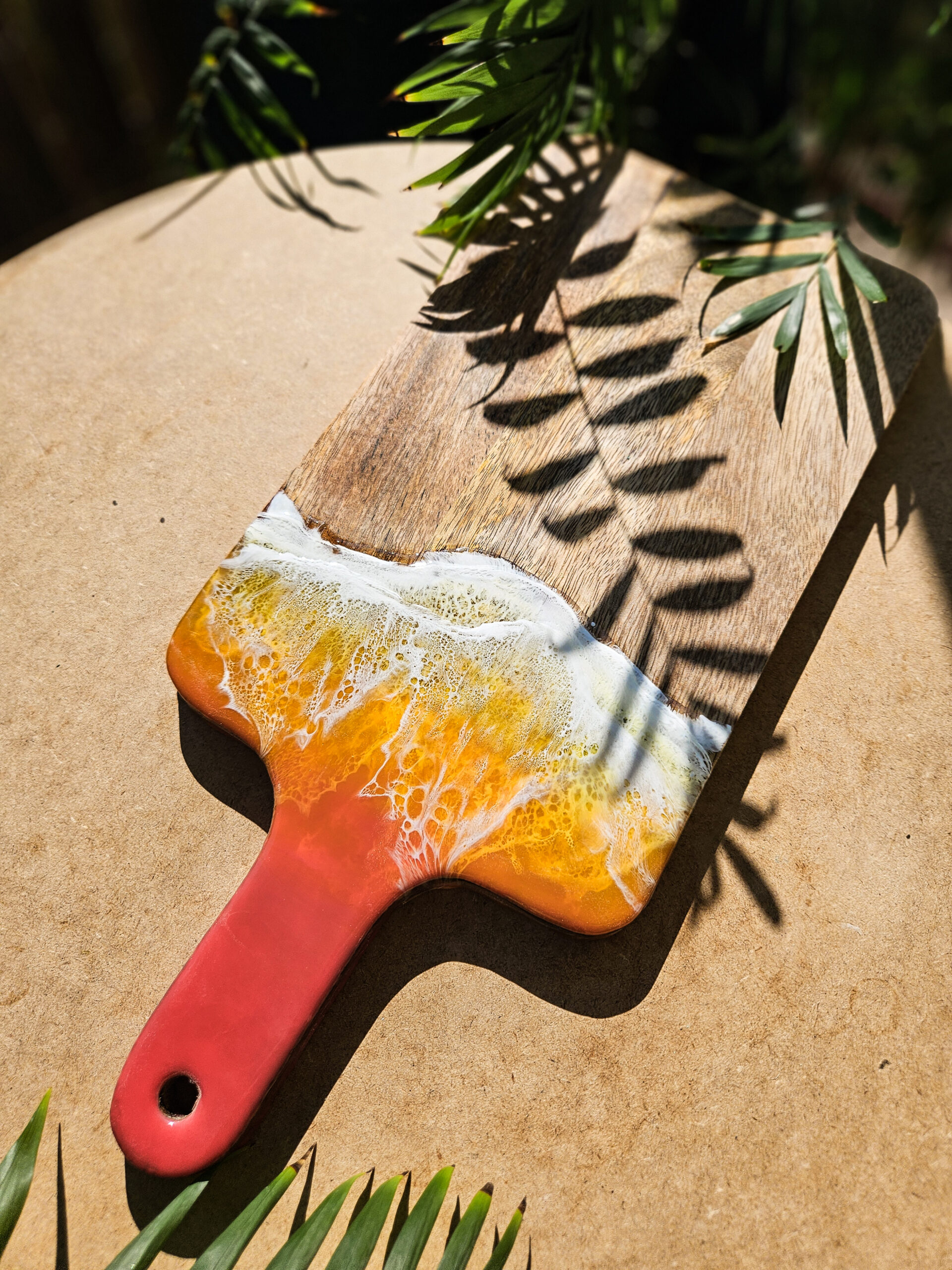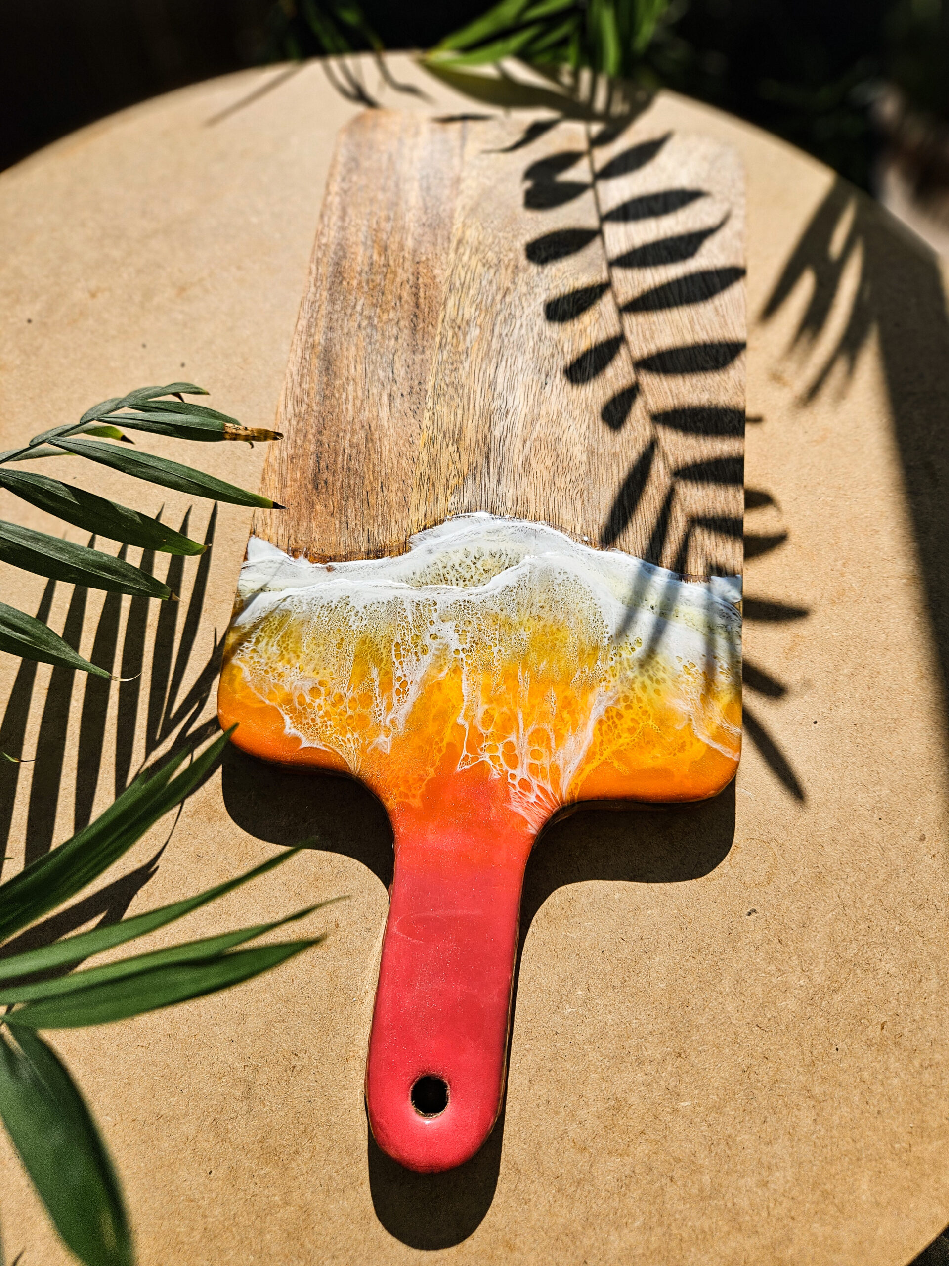 Odkryj tropikalny urok deski wykonanej z drewna mango, która łączy w sobie naturalne piękno z artystycznym wykończeniem żywicą, która przypomina morskie fale o zachodzie słońca.