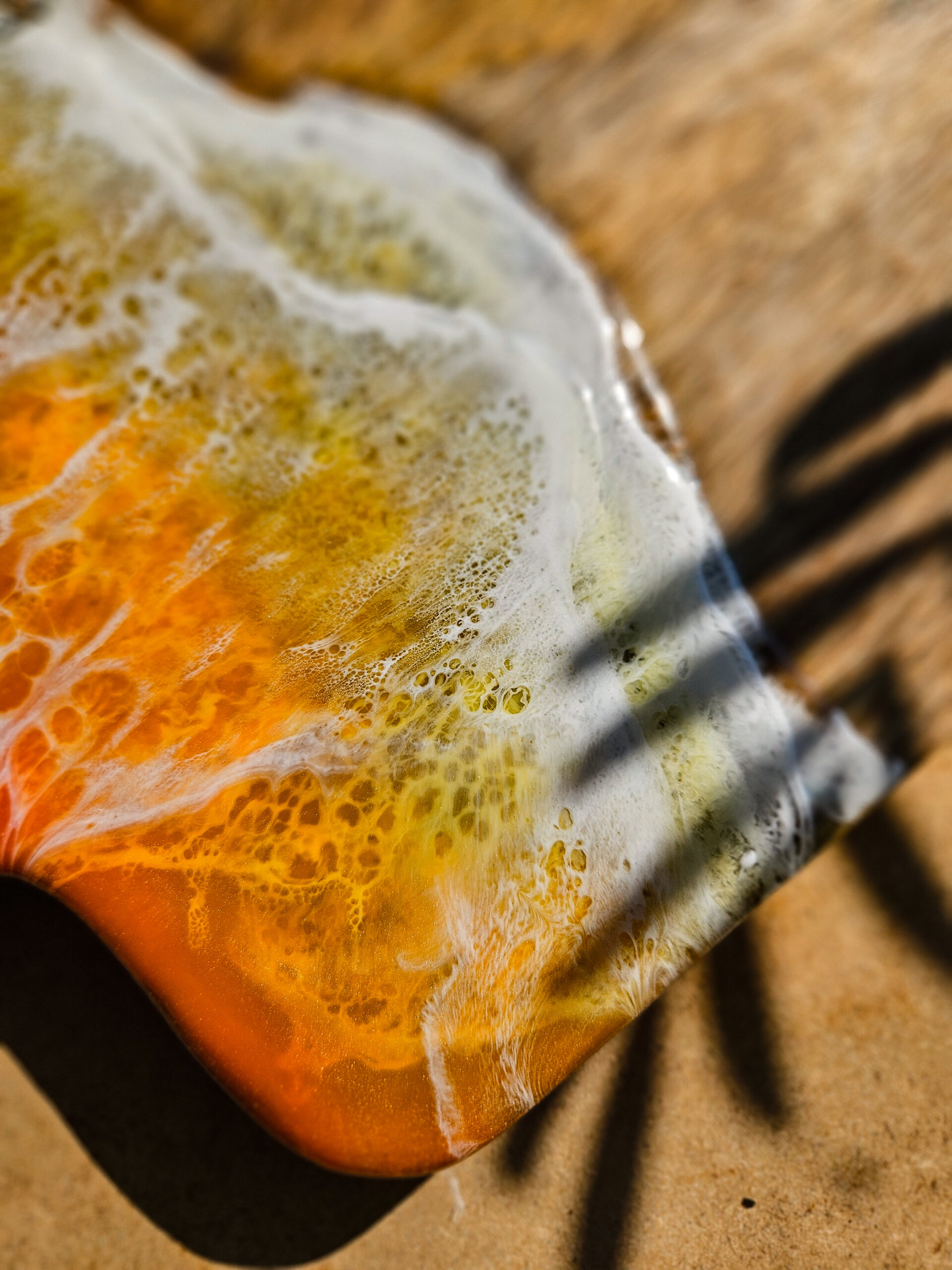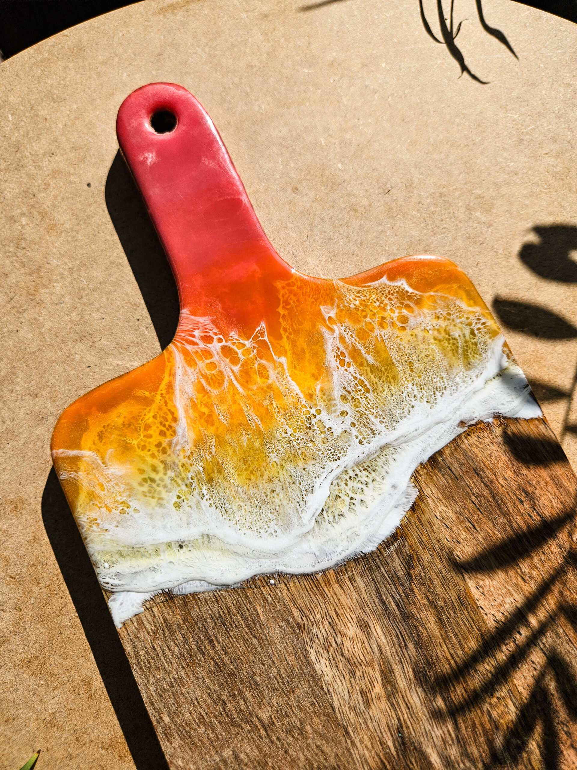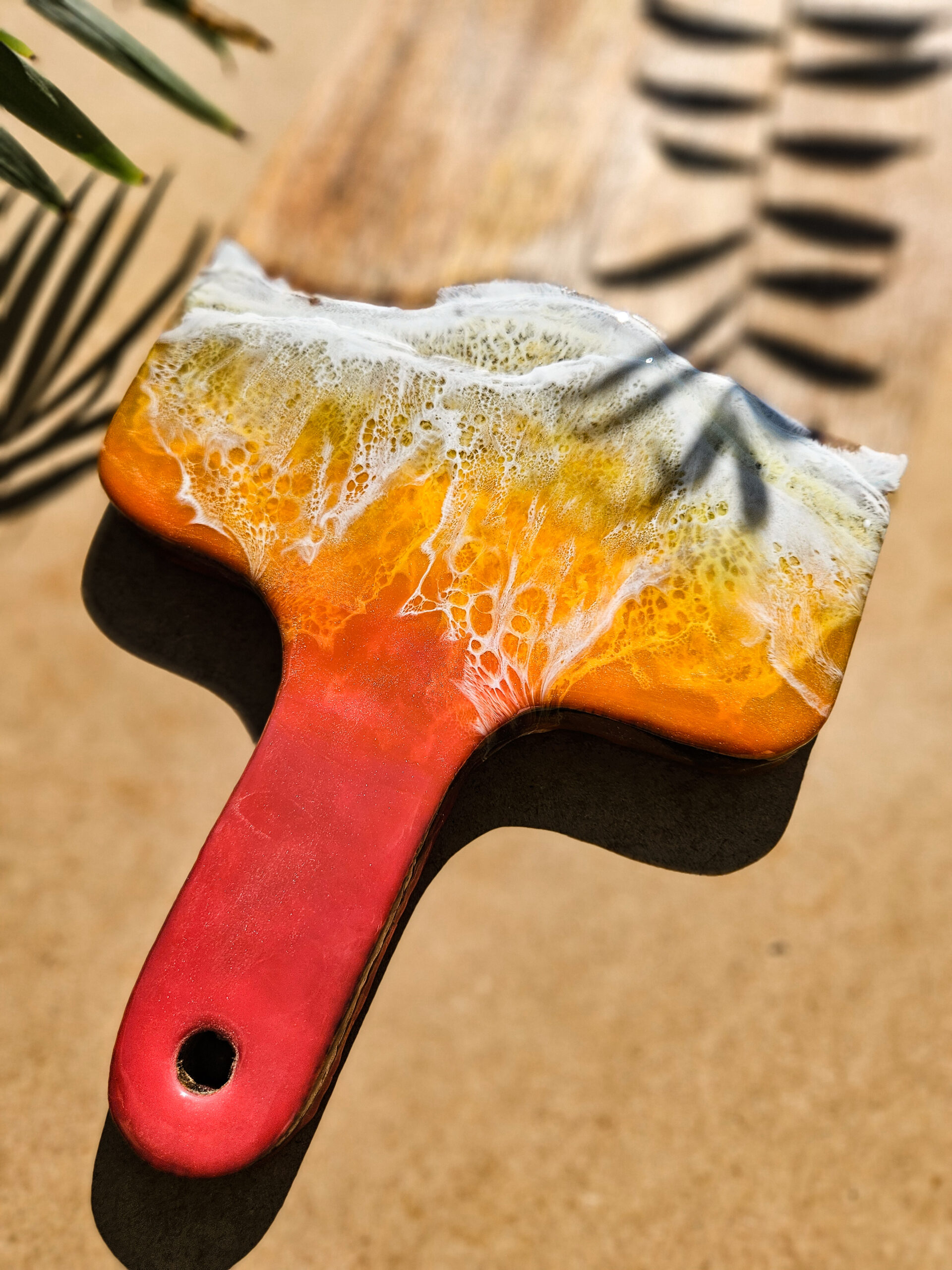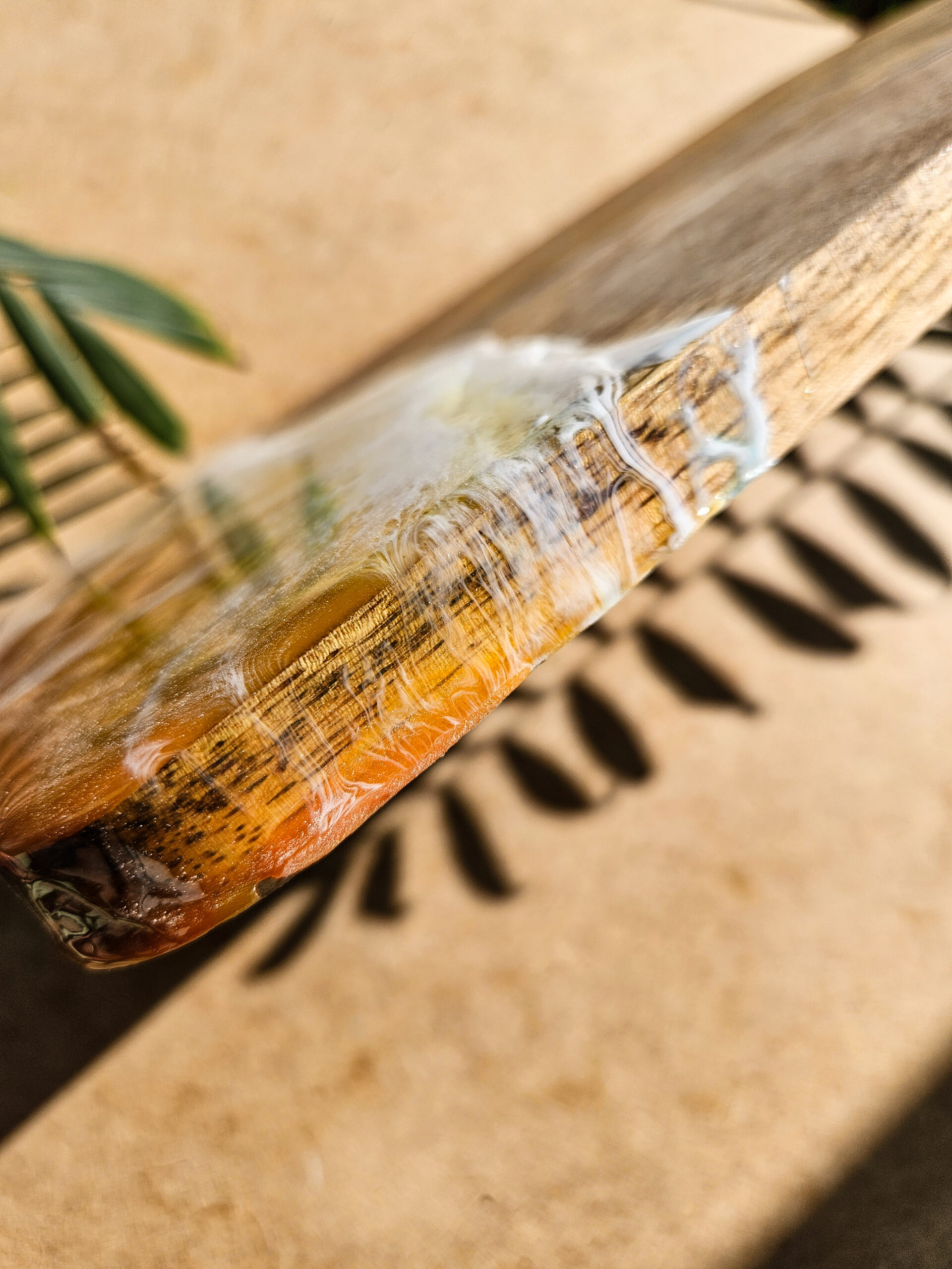 Odkryj tropikalny urok deski wykonanej z drewna mango, która łączy w sobie naturalne piękno z artystycznym wykończeniem żywicą, która przypomina morskie fale o zachodzie słońca.