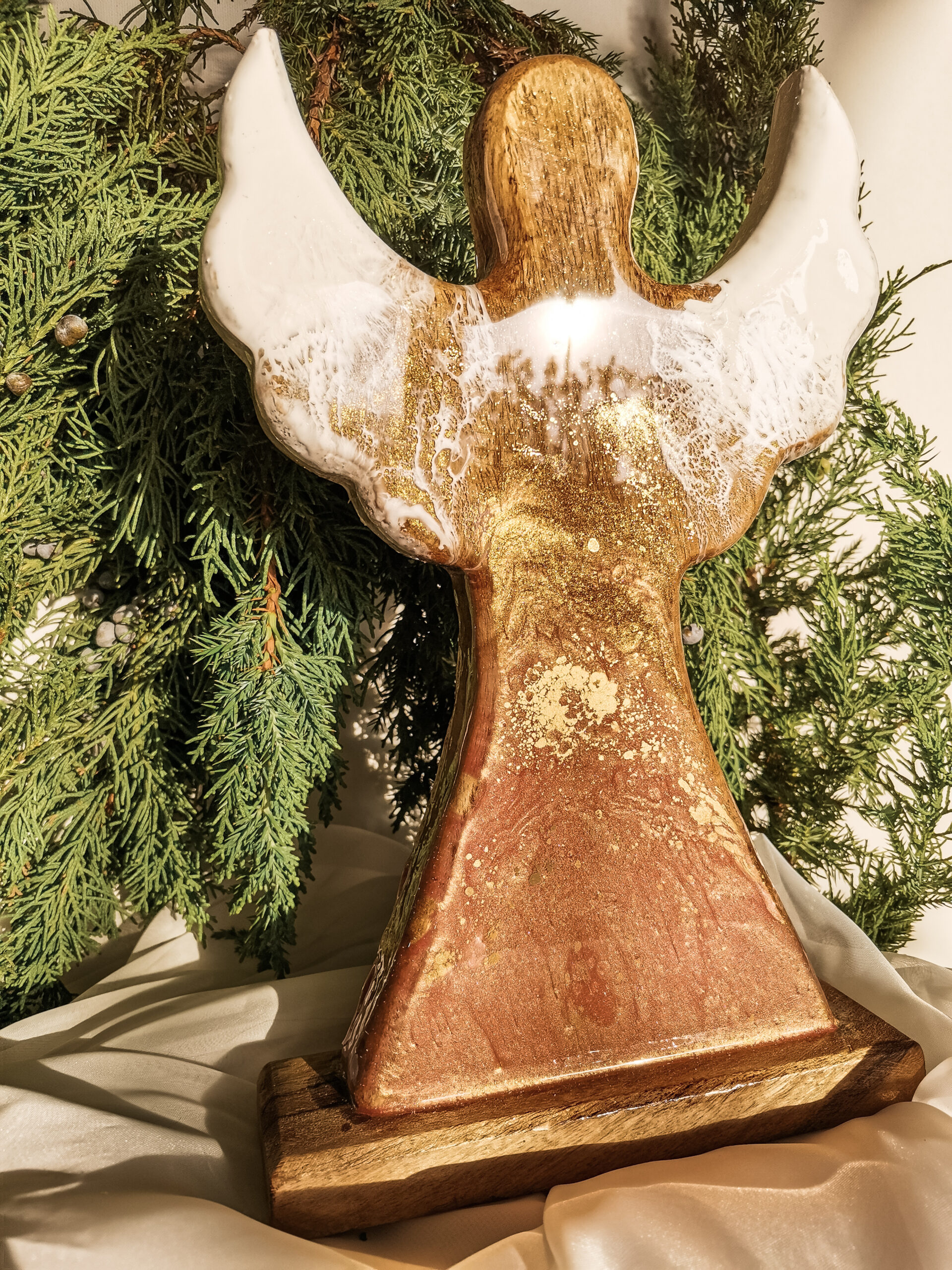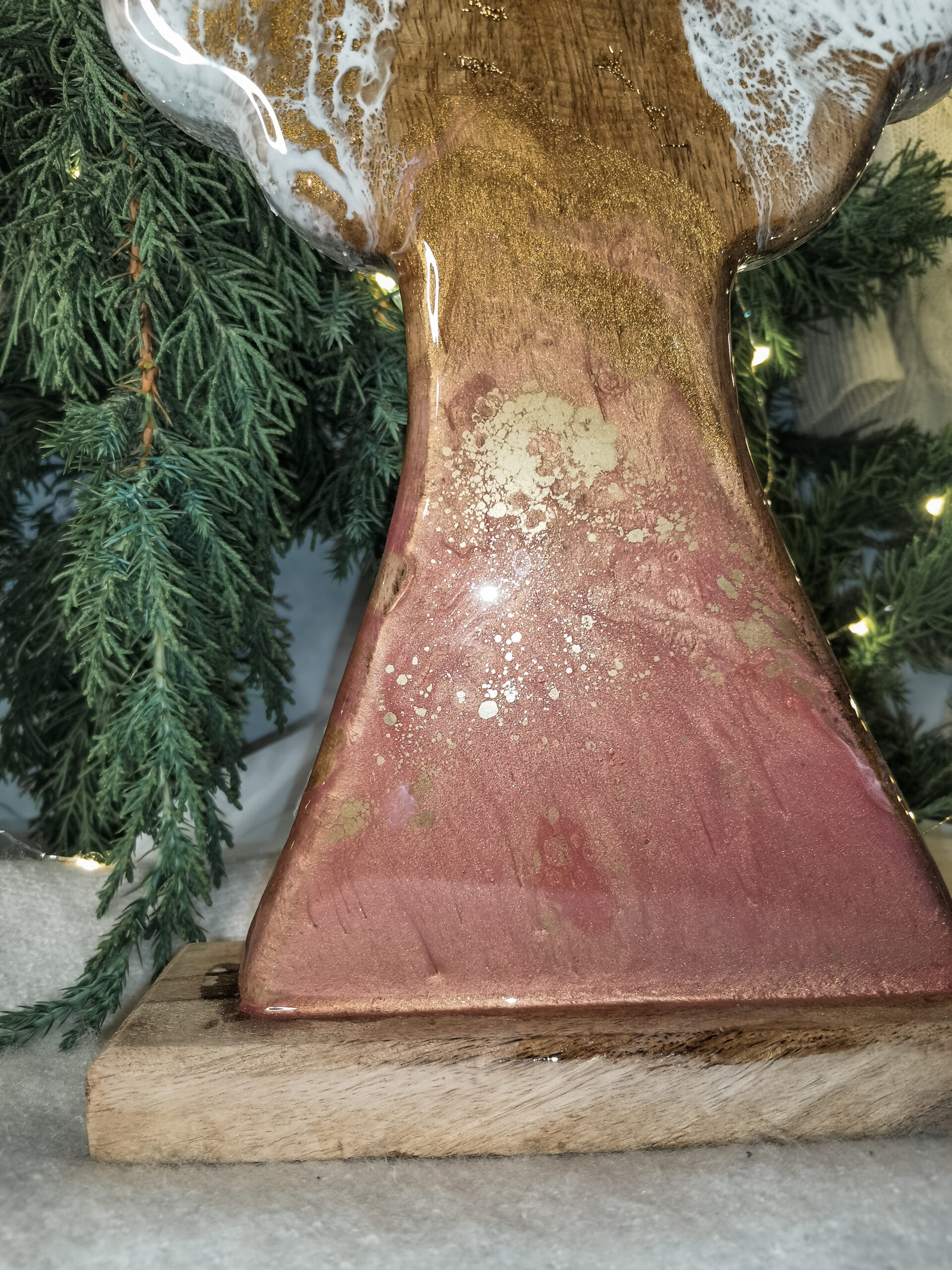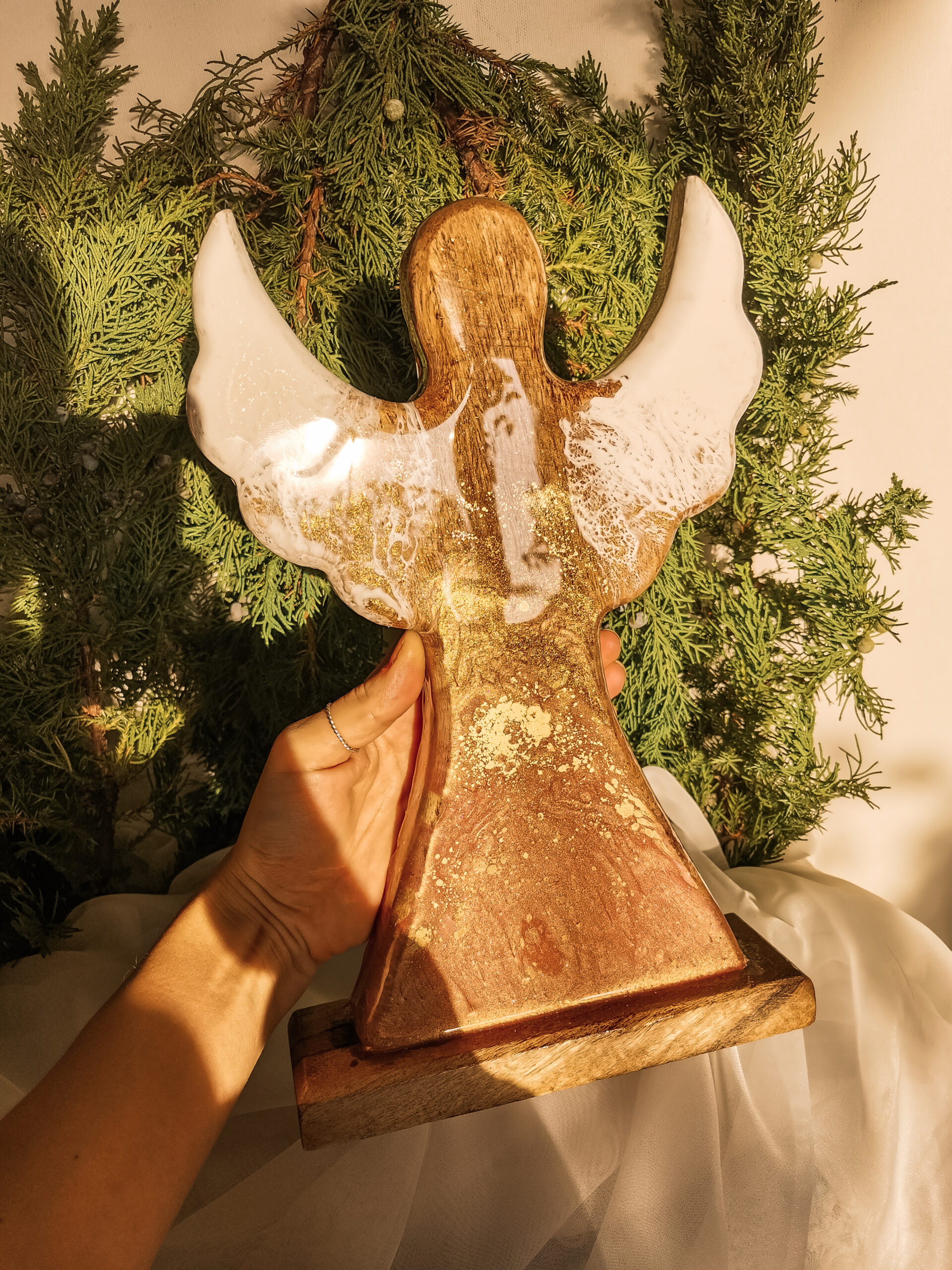 Cześć, dzień dobry! Przedstawiam Ci wyjątkowego Anioła, który wprowadzi do Twojego wnętrza magię świąt w eleganckim wydaniu. Wykonany został z egzotycznego drewna mango – z tyłu zachwyca naturalnym rysunkiem drewna, a z przodu ozdobiony jest żywicą w odcieniach różowego złota i bieli, z dodatkiem mieniącego się złotego pyłu. Każdy Anioł od spodu ostemplowany jest moim logiem, co czyni go jeszcze bardziej unikatowym.