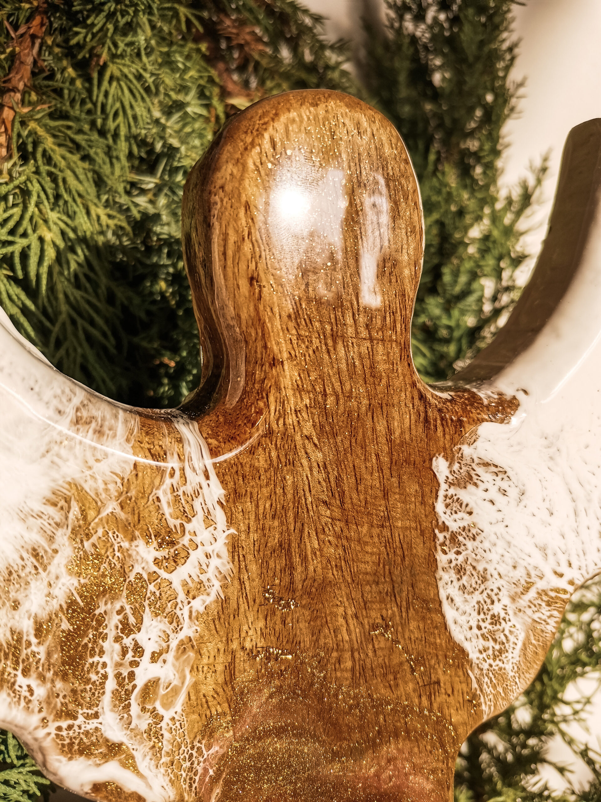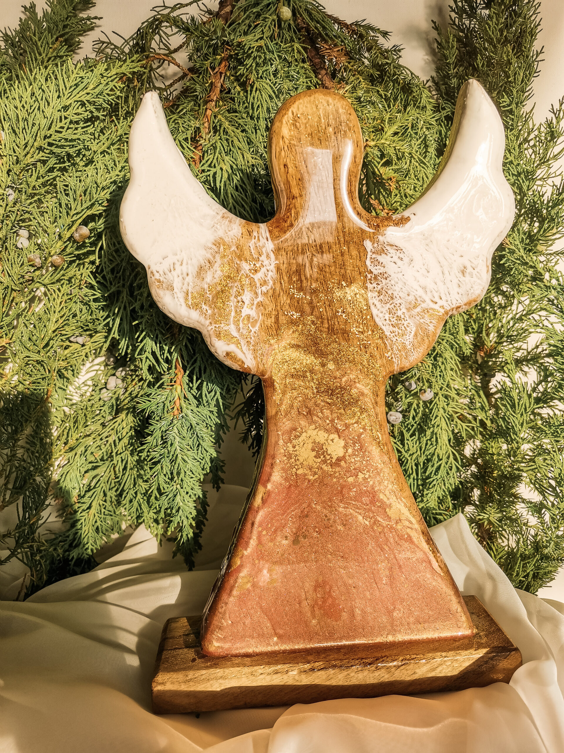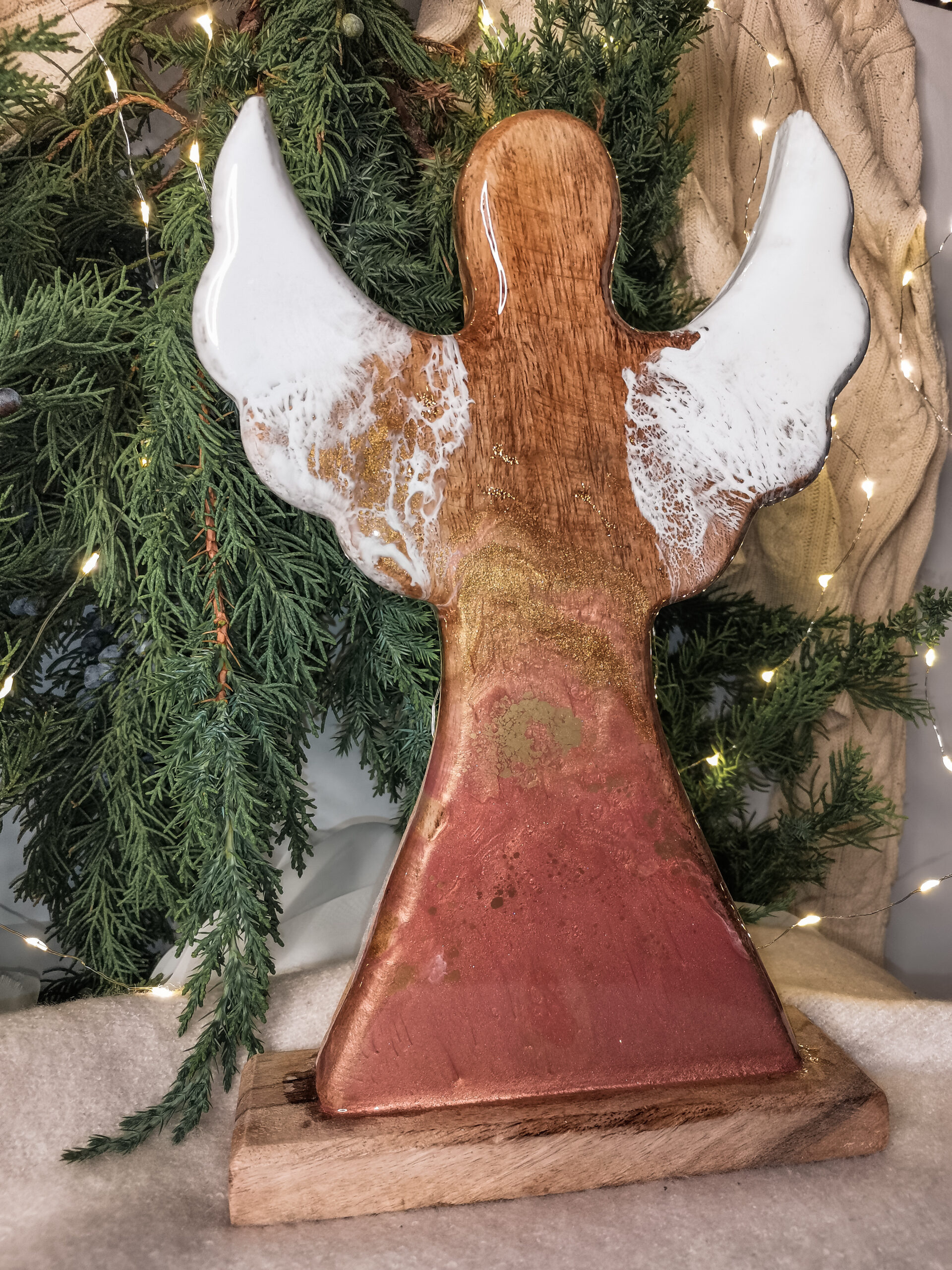 Cześć, dzień dobry! Przedstawiam Ci wyjątkowego Anioła, który wprowadzi do Twojego wnętrza magię świąt w eleganckim wydaniu. Wykonany został z egzotycznego drewna mango – z tyłu zachwyca naturalnym rysunkiem drewna, a z przodu ozdobiony jest żywicą w odcieniach różowego złota i bieli, z dodatkiem mieniącego się złotego pyłu. Każdy Anioł od spodu ostemplowany jest moim logiem, co czyni go jeszcze bardziej unikatowym.