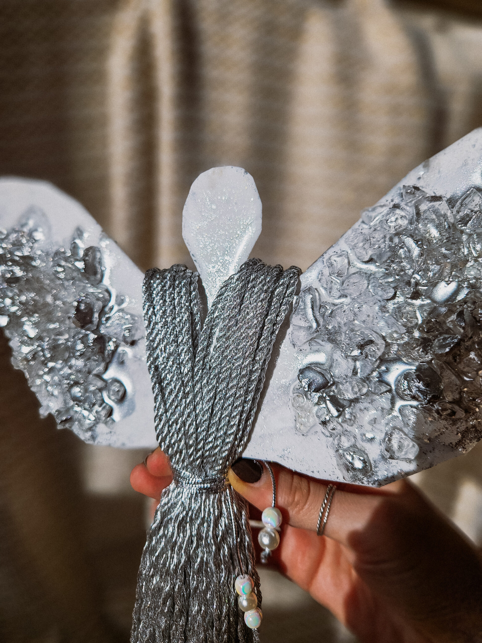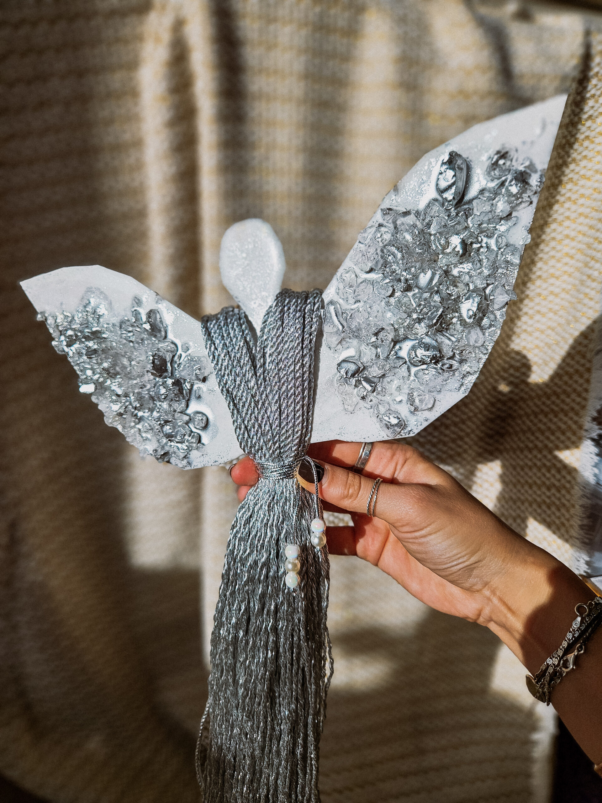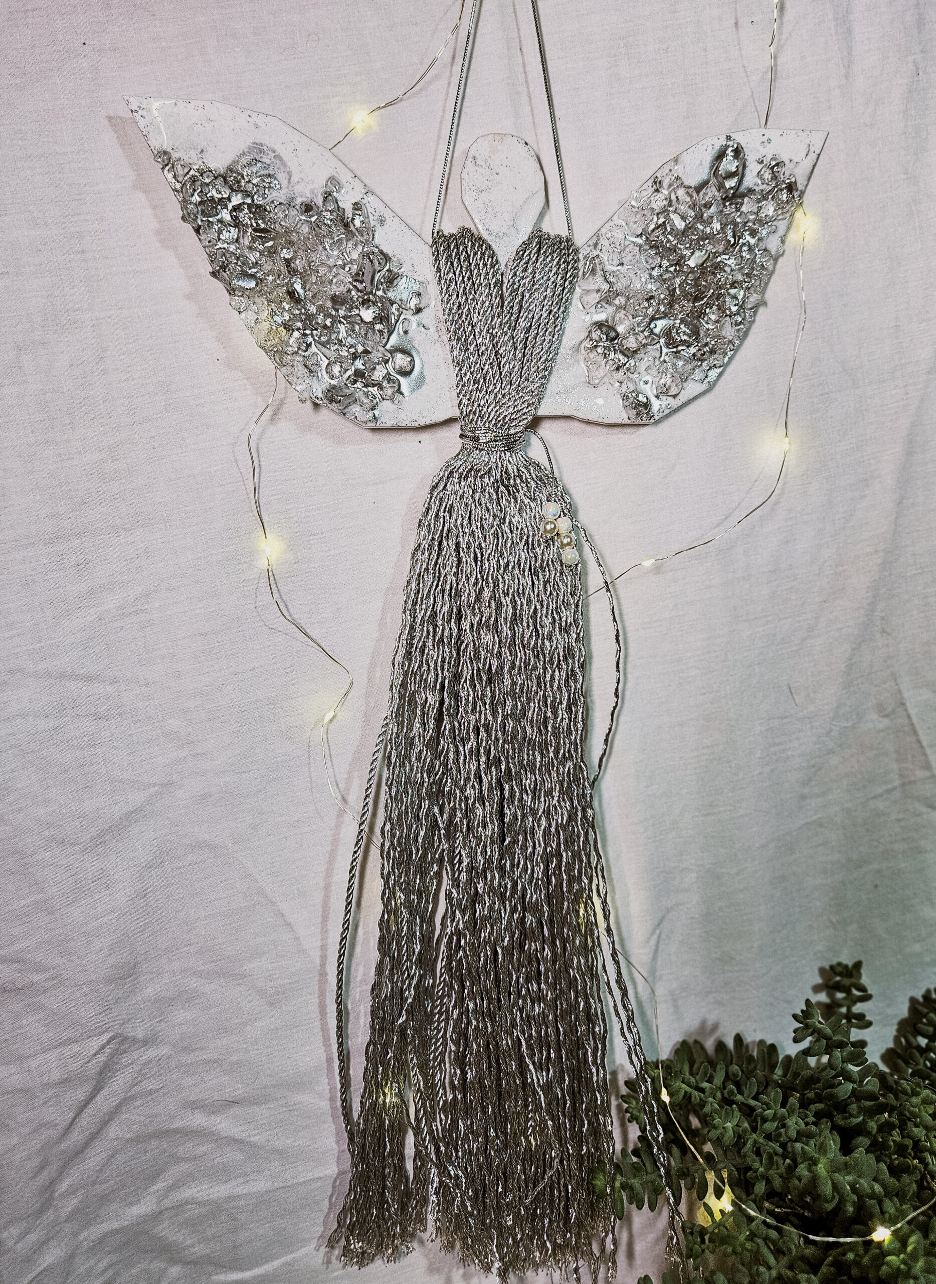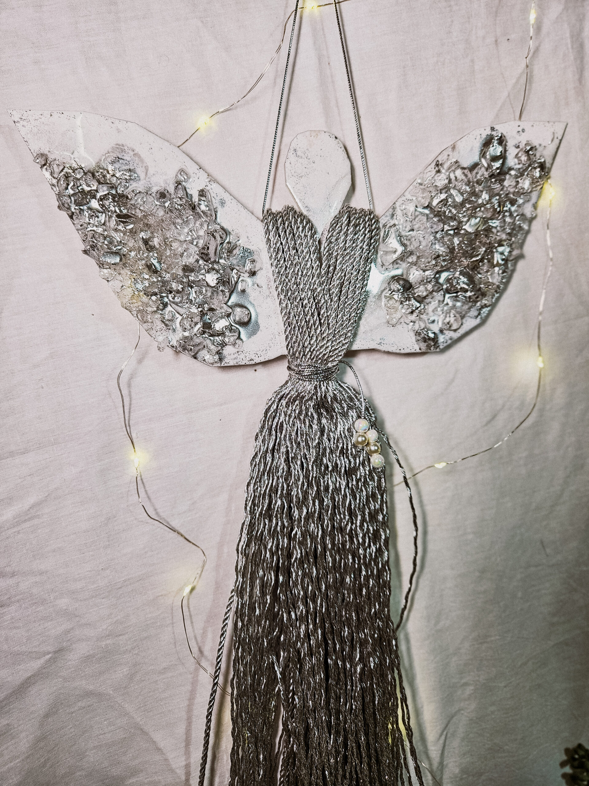 Cześć, dzień dobry! Przedstawiam Ci ręcznie wykonanego Anioła, który wniesie do Twojego domu magię, ciepło i odrobinę świątecznego blasku. Skrzydła Anioła wykonane są z żywicy, która pięknie się mieni – w tej wersji w odcieniach bieli z dodatkiem srebra oraz srebrnych kamieni, natomiast sukienka powstała z srebrnego, ozdobnego sznurka. Całość zdobi błyszczący sznureczek z koralikami w talii, który dodaje subtelnej elegancji.