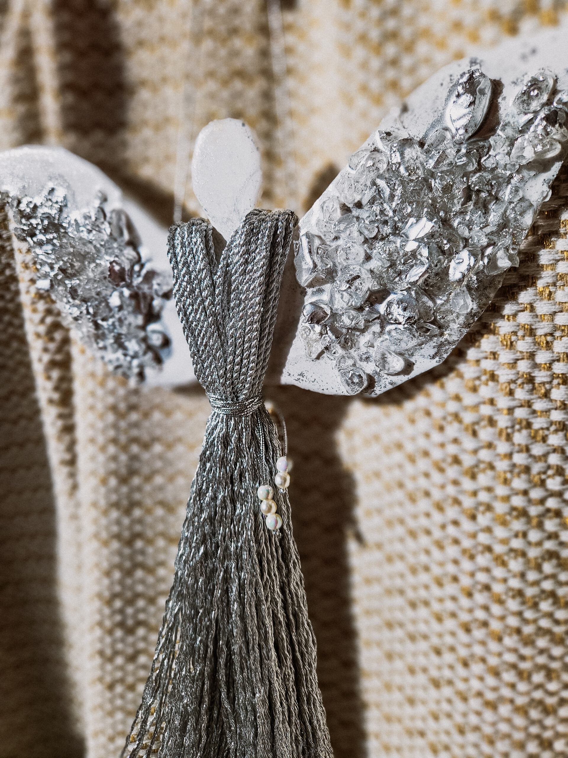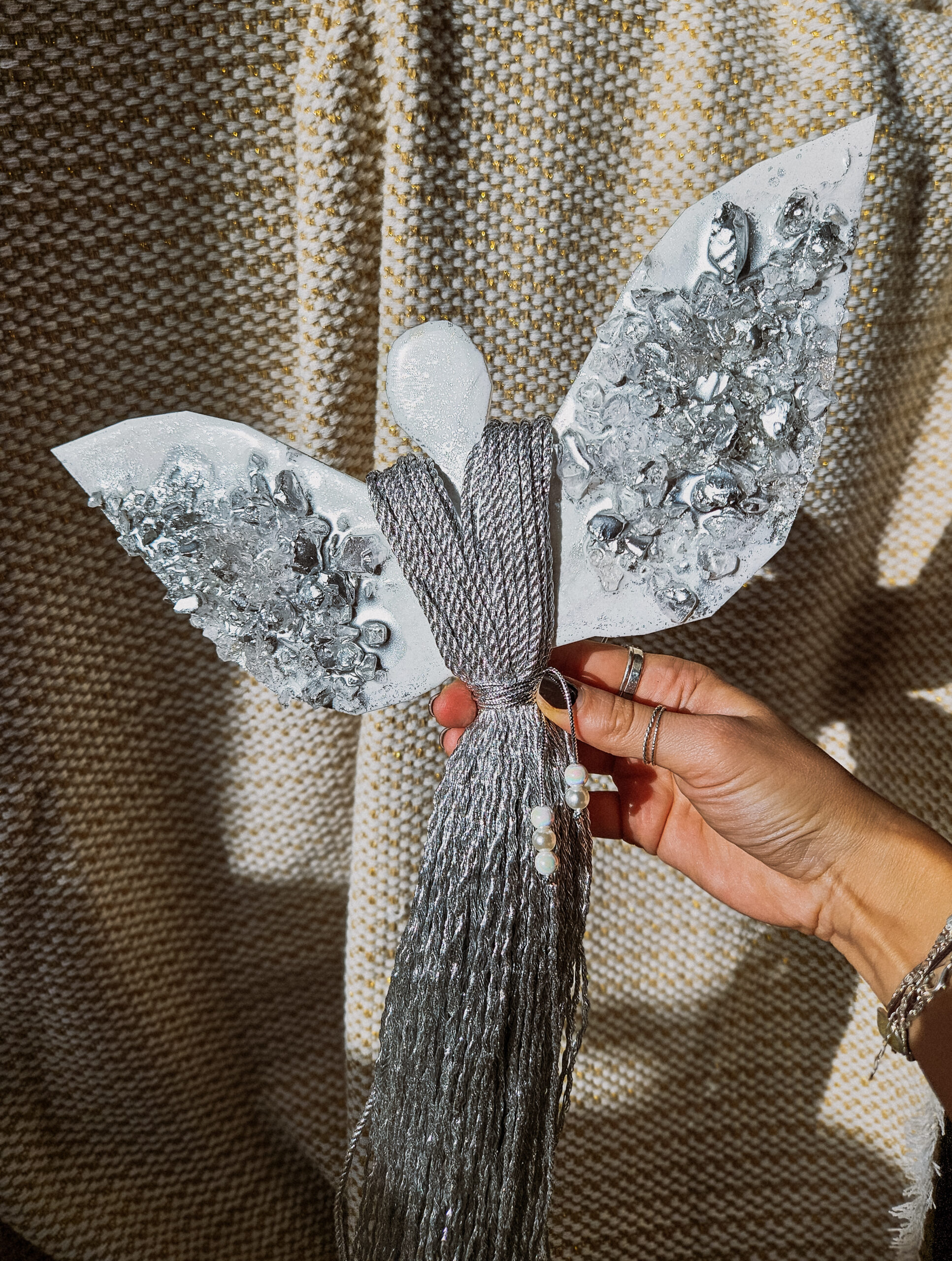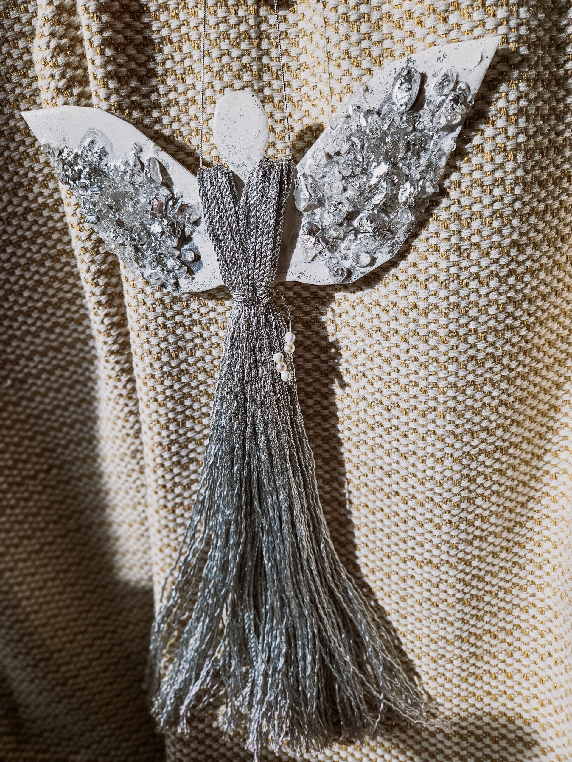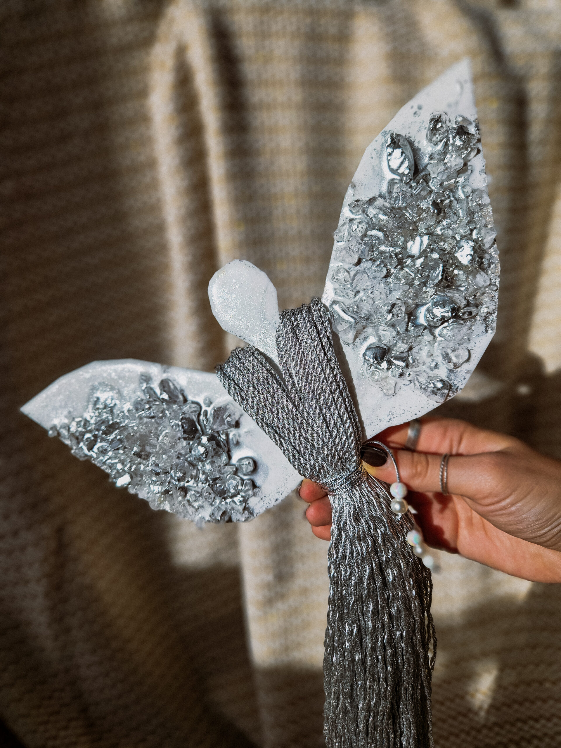 Cześć, dzień dobry! Przedstawiam Ci ręcznie wykonanego Anioła, który wniesie do Twojego domu magię, ciepło i odrobinę świątecznego blasku. Skrzydła Anioła wykonane są z żywicy, która pięknie się mieni – w tej wersji w odcieniach bieli z dodatkiem srebra oraz srebrnych kamieni, natomiast sukienka powstała z srebrnego, ozdobnego sznurka. Całość zdobi błyszczący sznureczek z koralikami w talii, który dodaje subtelnej elegancji.