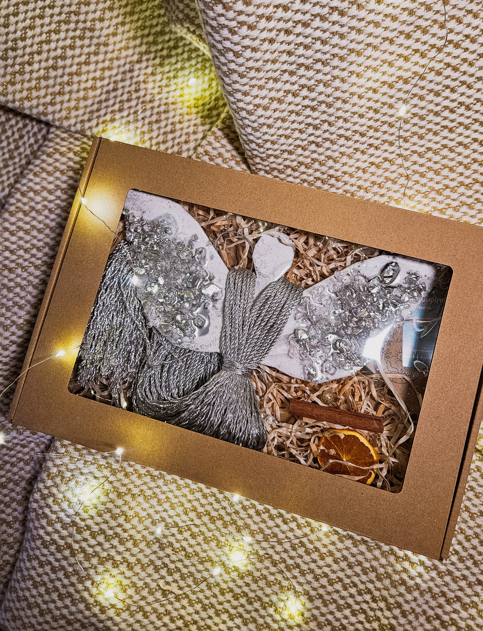 Każdy anioł pakowany jest z największą starannością – w pudełku z naturalnym wypełnieniem i wizytówką. W okresie świątecznym dodaję dodatkowe elementy: suszone pomarańcze, orzechy i inne naturalne dekoracje. Dzięki temu jest od razu gotowy, aby wręczyć go komuś bliskiemu.