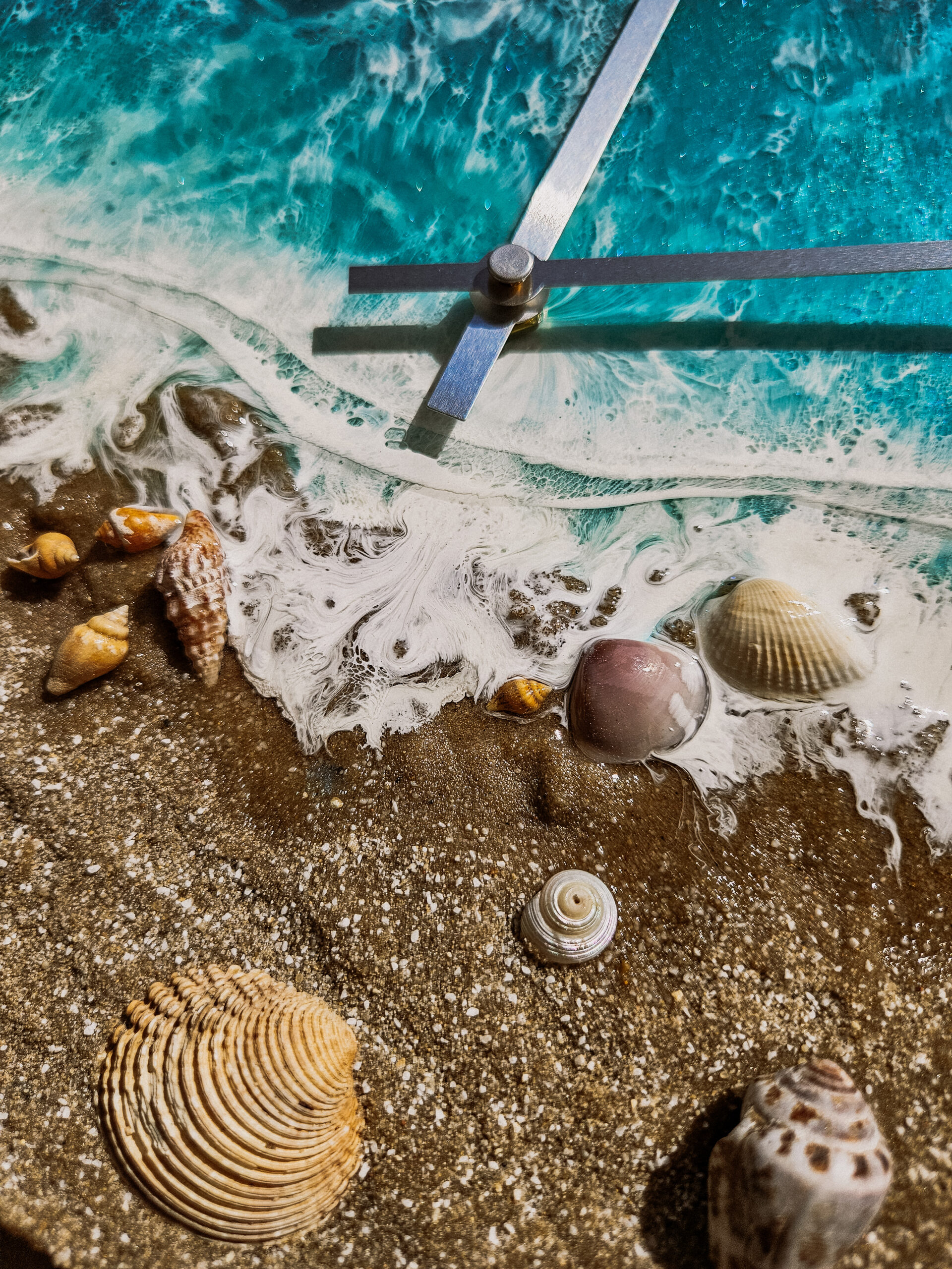 Wyjątkowy zegar ścienny przedstawiający plażę ozdobioną naturalnymi muszlami oraz morskie fale, w pełni oddaje piękno natury i wprowadza w relaksacyjny nastrój. Ten zegar zachwyci każdego miłośnika przyrody i unikalnych wnętrzarskich rozwiązań.