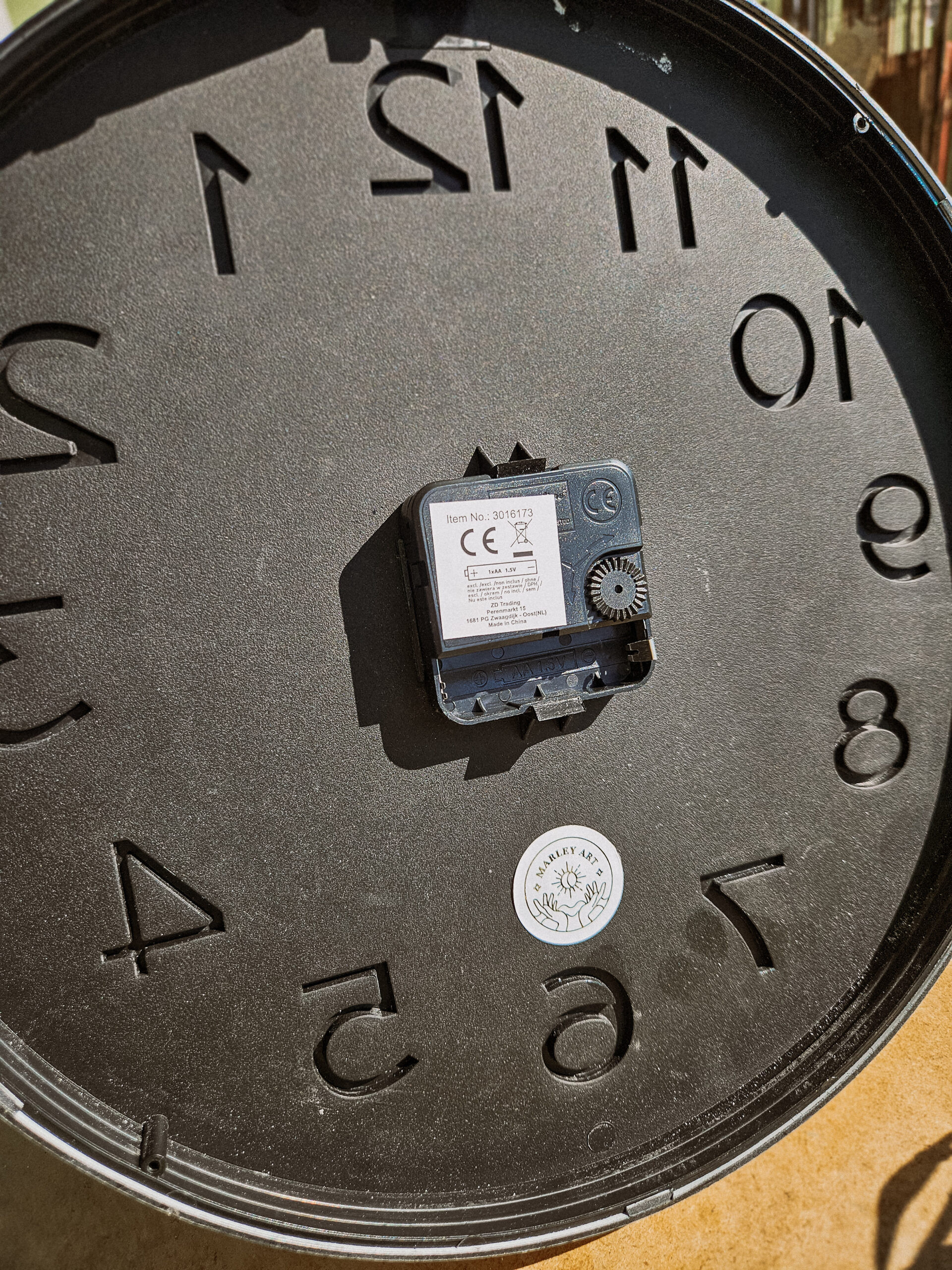 Zegar ma średnicę 30cm oraz 5 cm grubości. Zegar jest w białej ramie wykonanej z tworzywa oraz posiada szkło na froncie. Zegar ma mechanizm tykający.