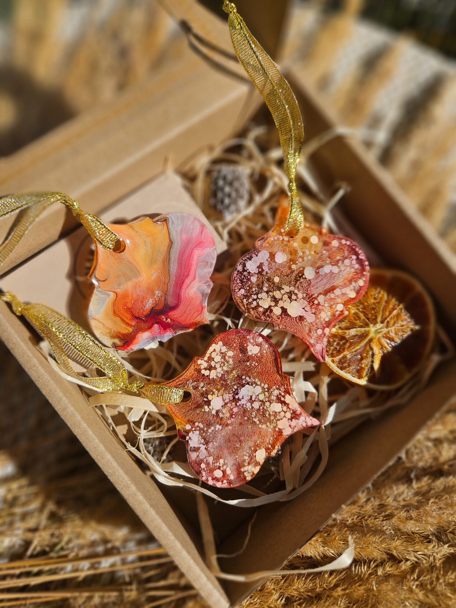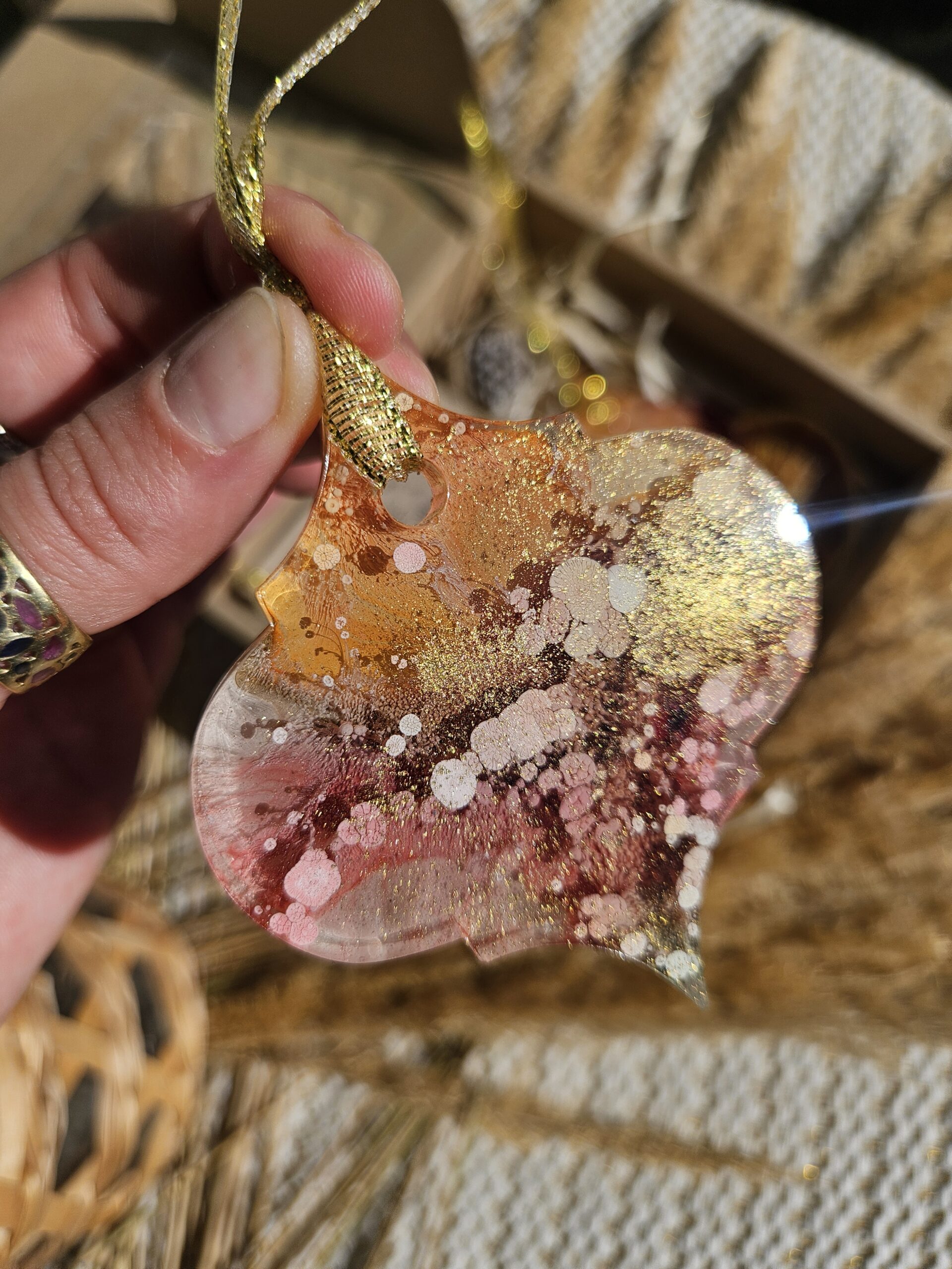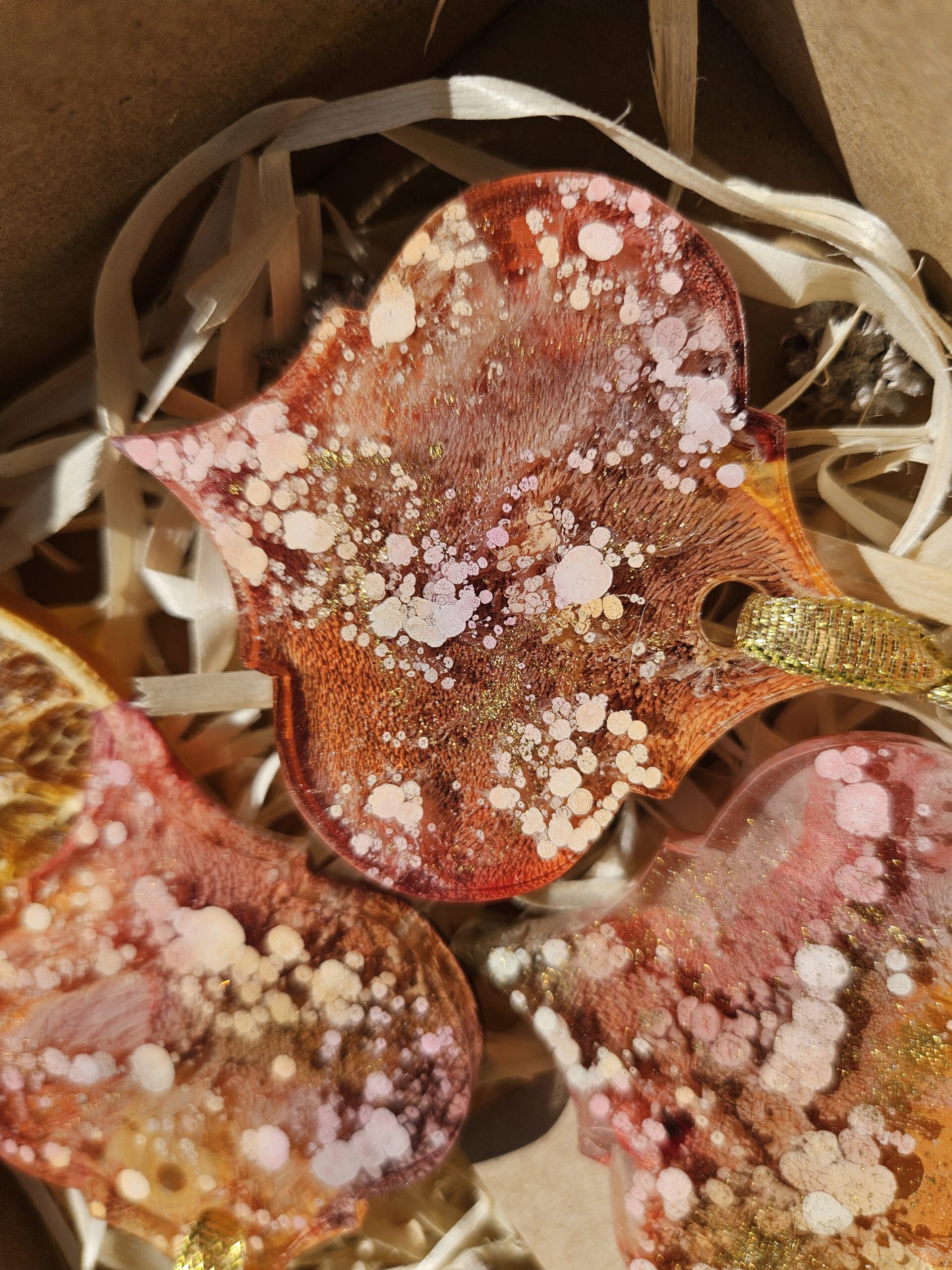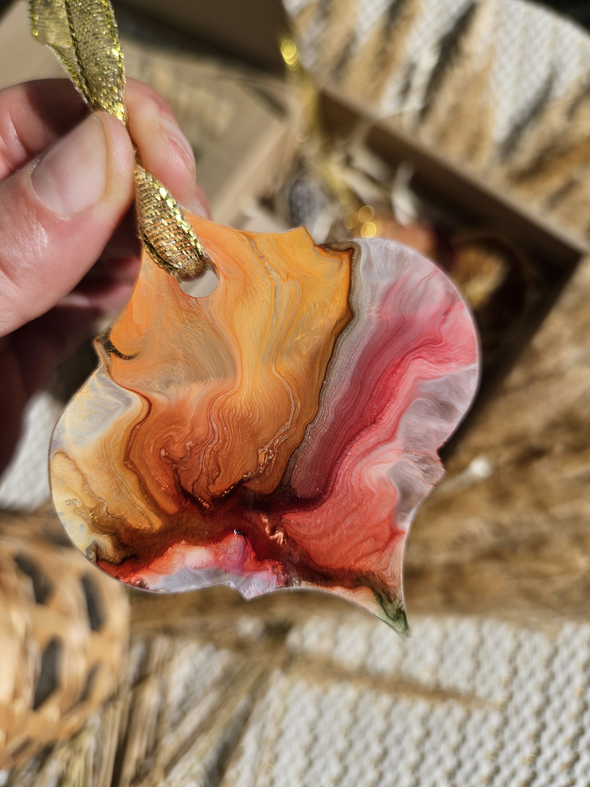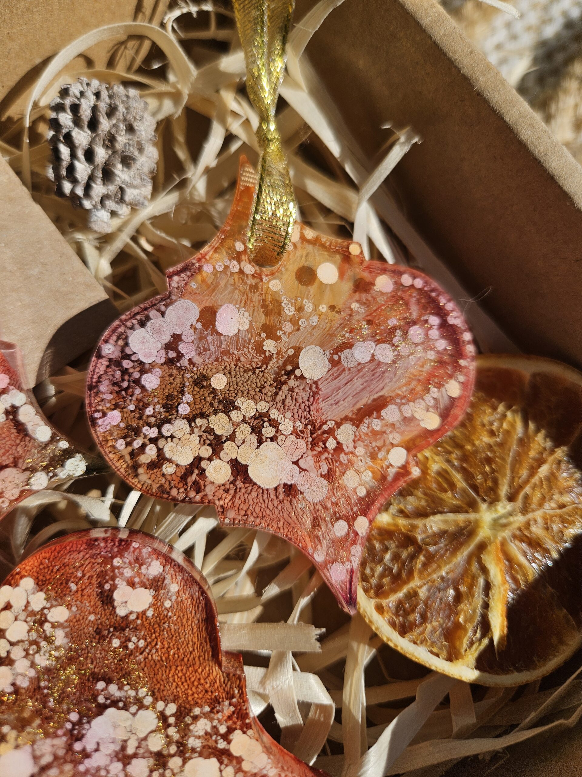 Cześć, dzień dobry! Przedstawiam Ci ręcznie wykonane zawieszki, które wniosą do Twojego domu magię i odrobinę świątecznego blasku. Zawieszki wykonane są z żywicy, która pięknie się mieni – w tej wersji w odcieniach czerwieni, pomarańczy, bieli i złota, zawieszone na złotej wstążce.