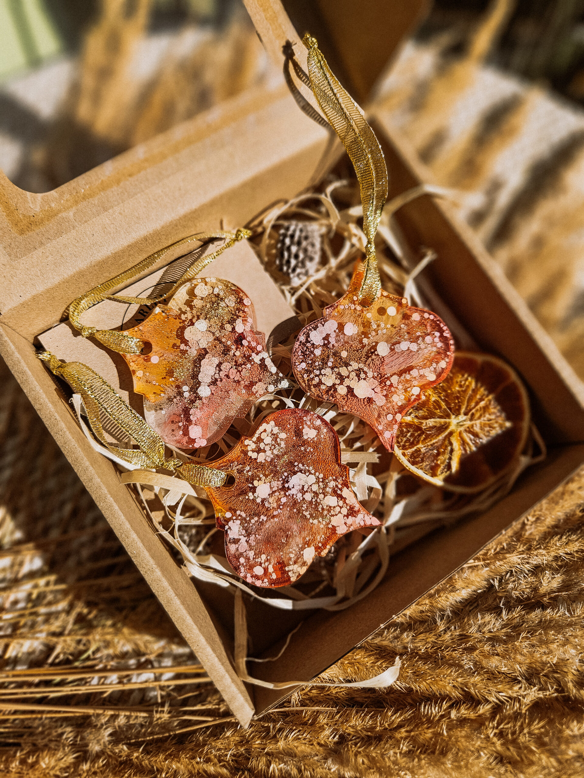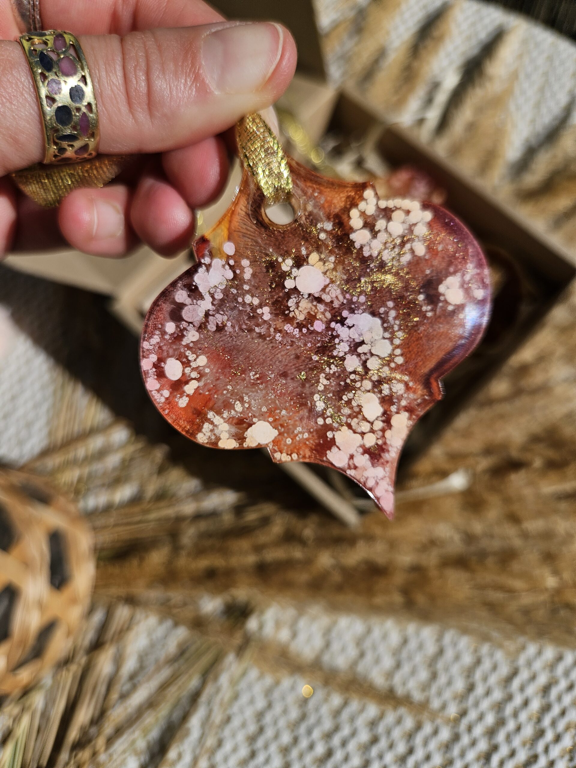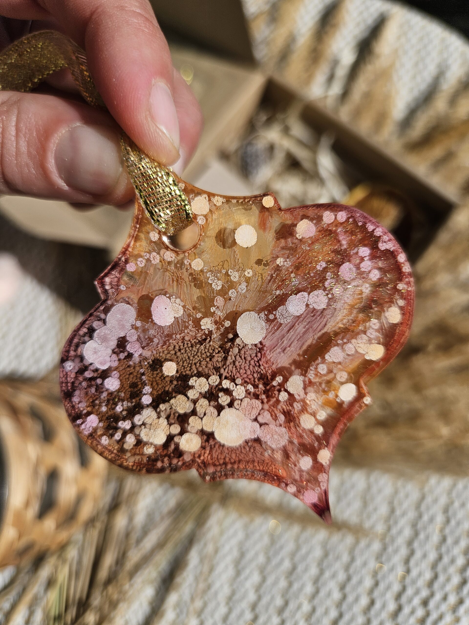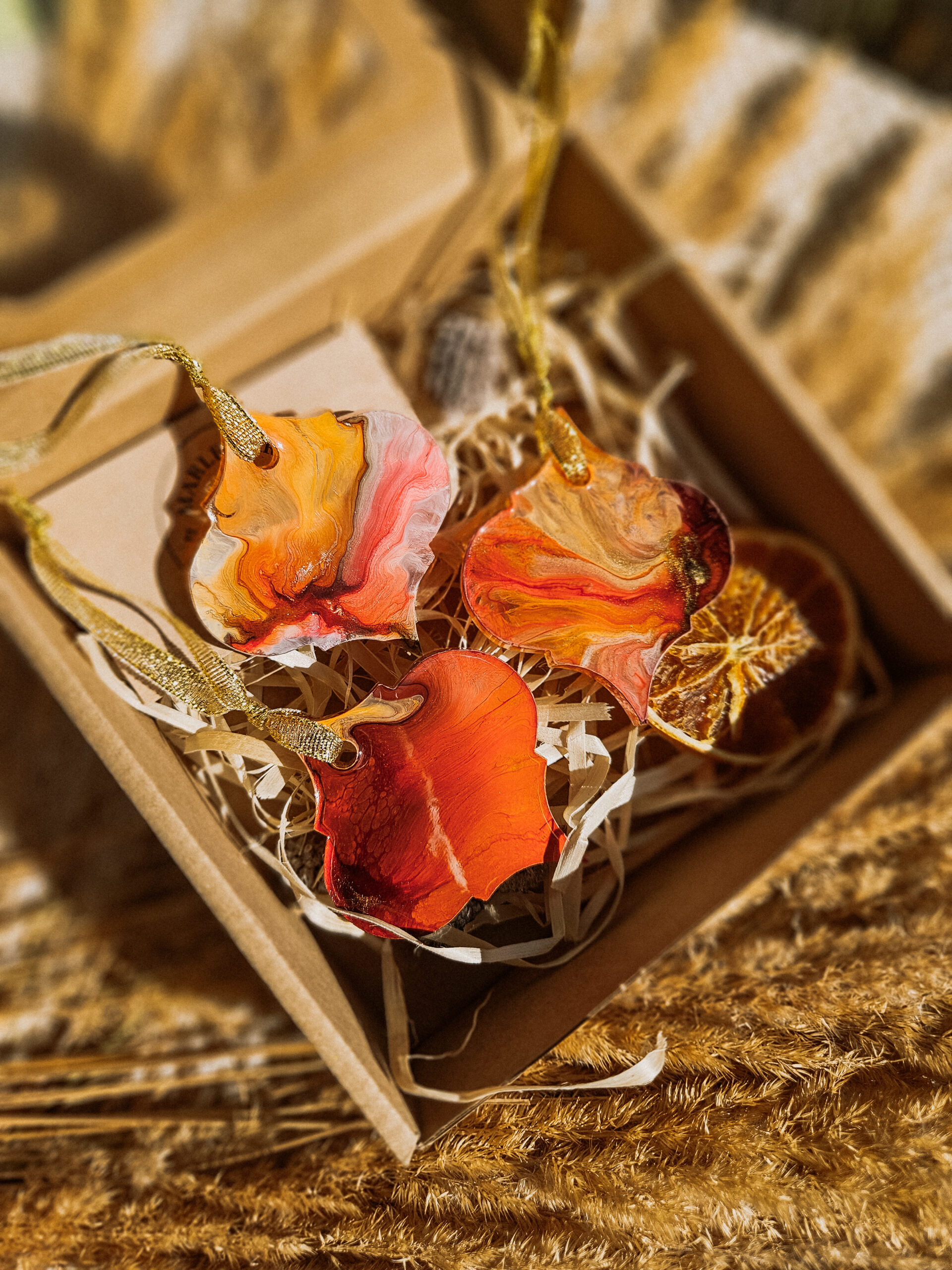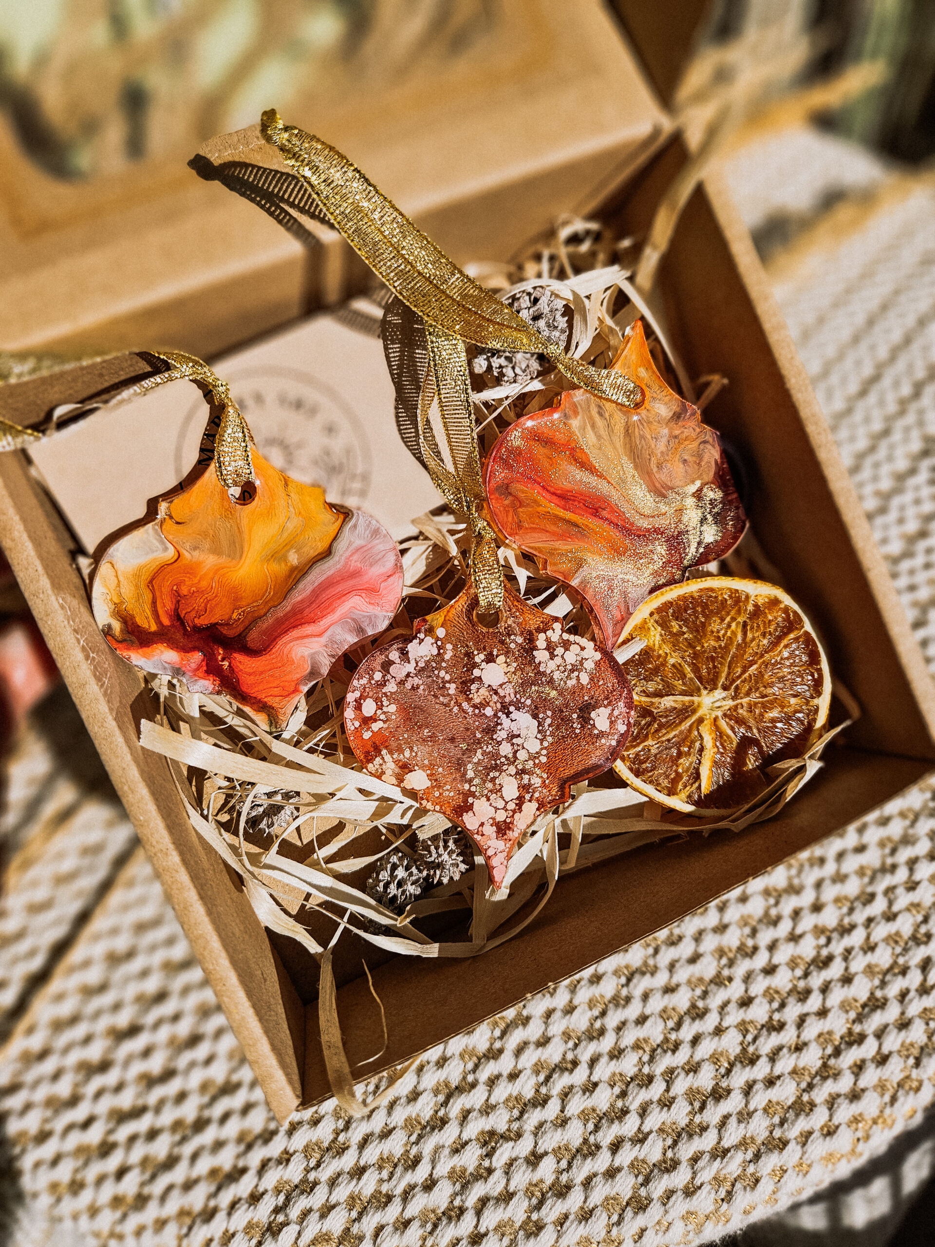 Cześć, dzień dobry! Przedstawiam Ci ręcznie wykonane zawieszki, które wniosą do Twojego domu magię i odrobinę świątecznego blasku. Zawieszki wykonane są z żywicy, która pięknie się mieni – w tej wersji w odcieniach czerwieni, pomarańczy, bieli i złota, zawieszone na złotej wstążce.