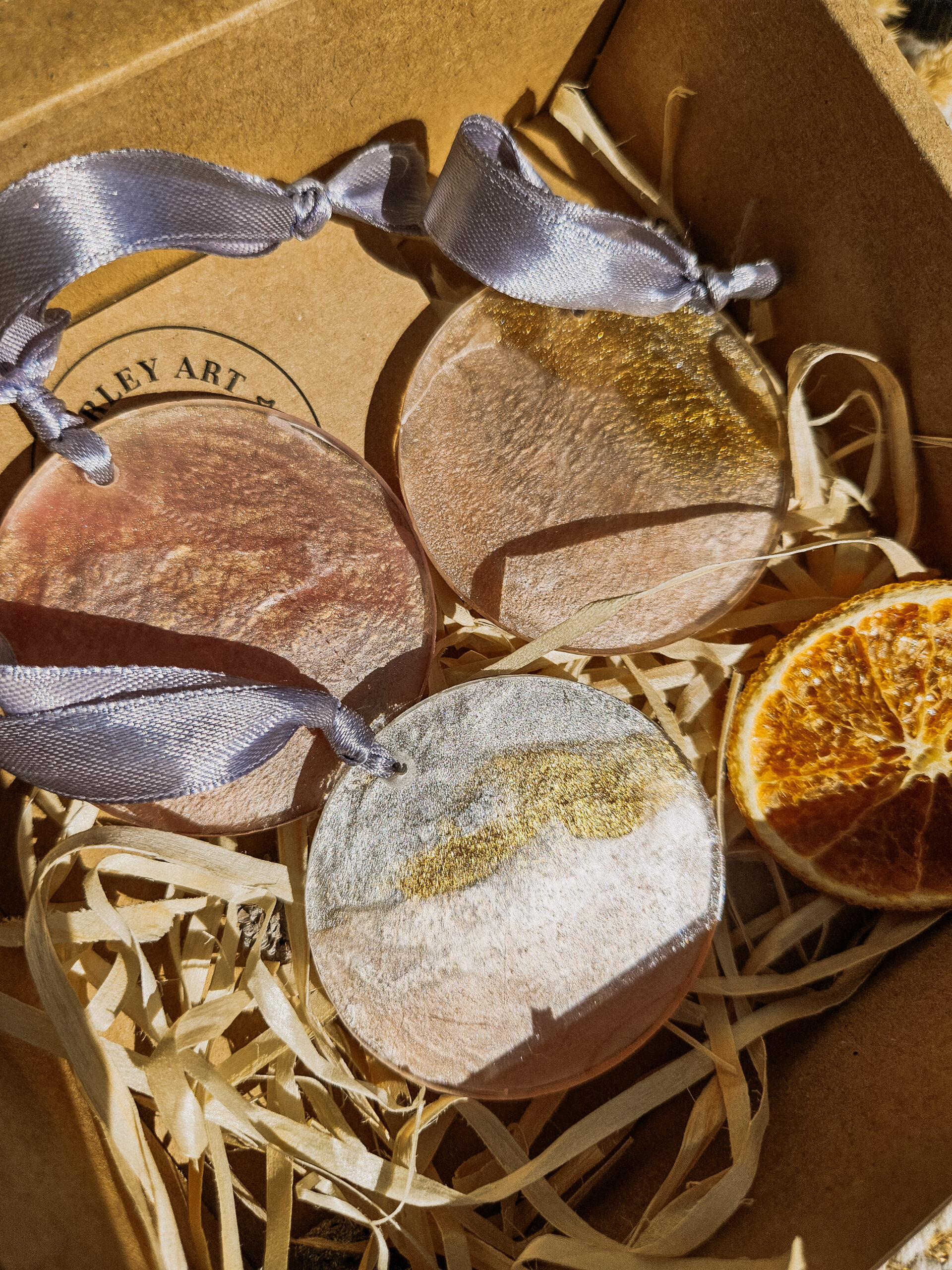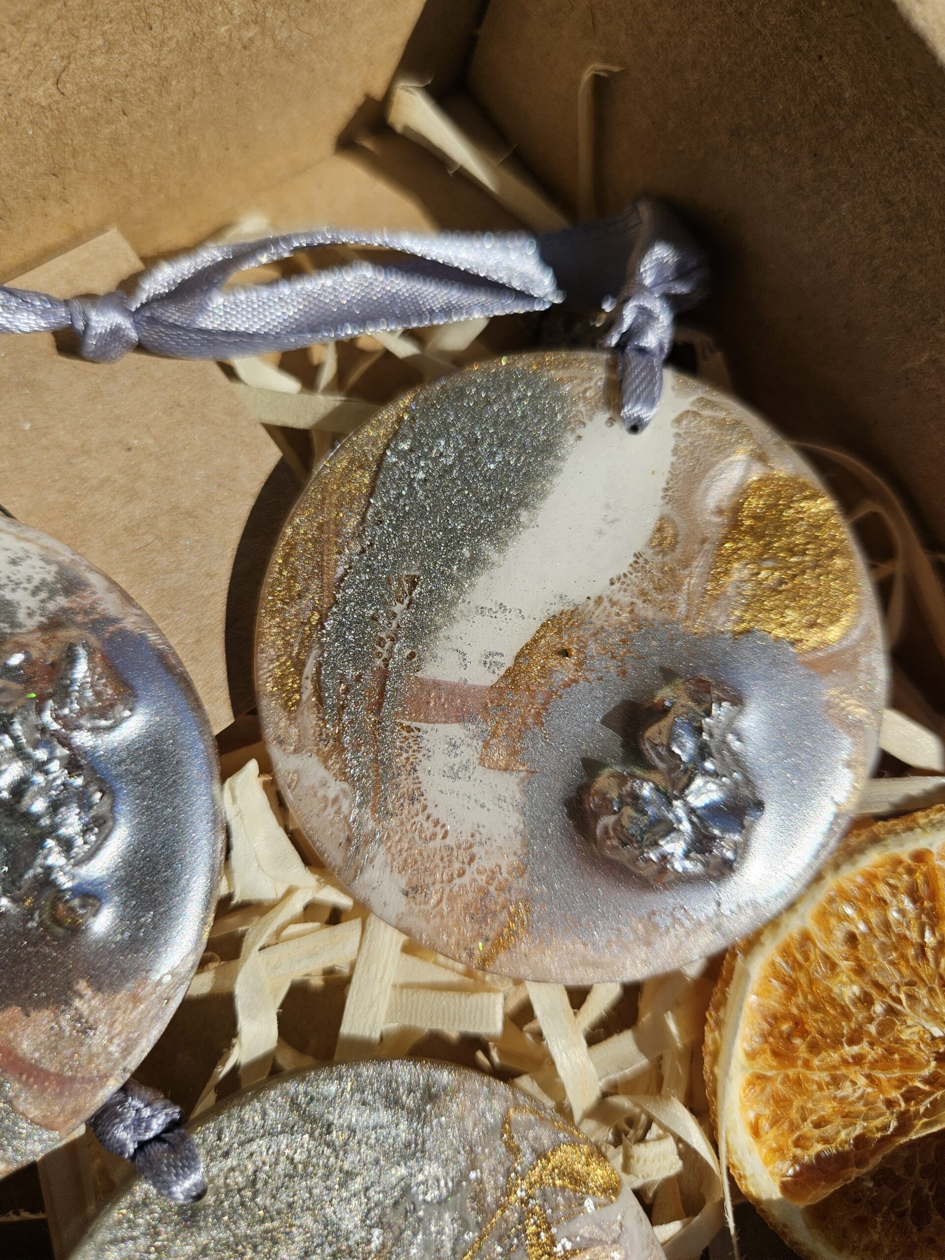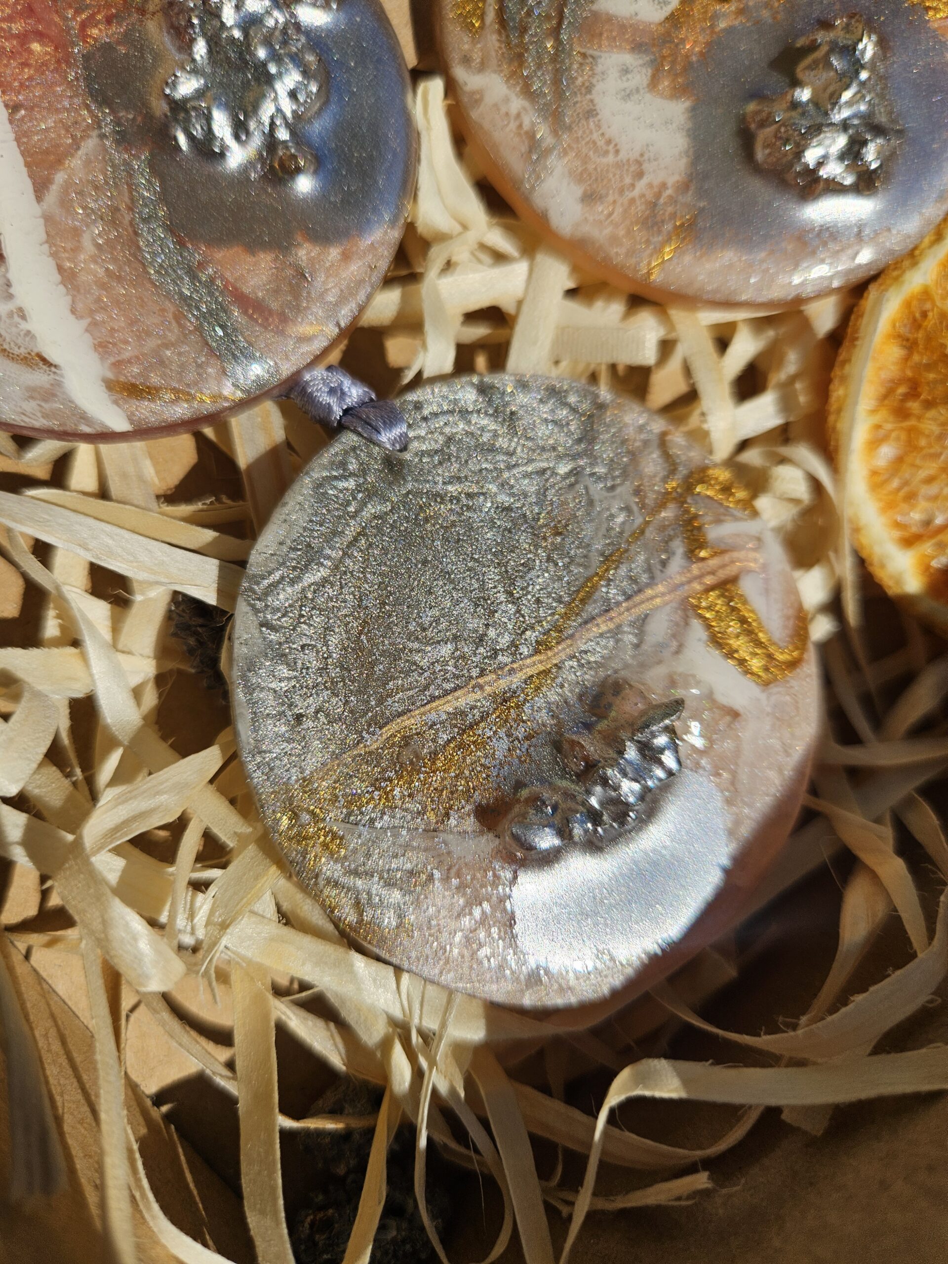 Cześć, dzień dobry! Przedstawiam Ci ręcznie wykonane zawieszki, które wniosą do Twojego domu magię i odrobinę świątecznego blasku. Zawieszki wykonane są z żywicy, która pięknie się mieni – w tej wersji w odcieniach różu, bieli, srebra i złota, zawieszone na srebrnej wstążce.
