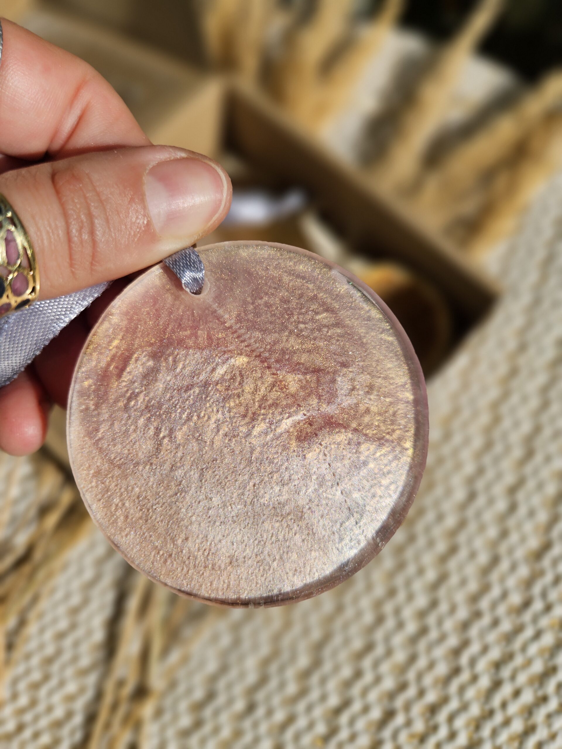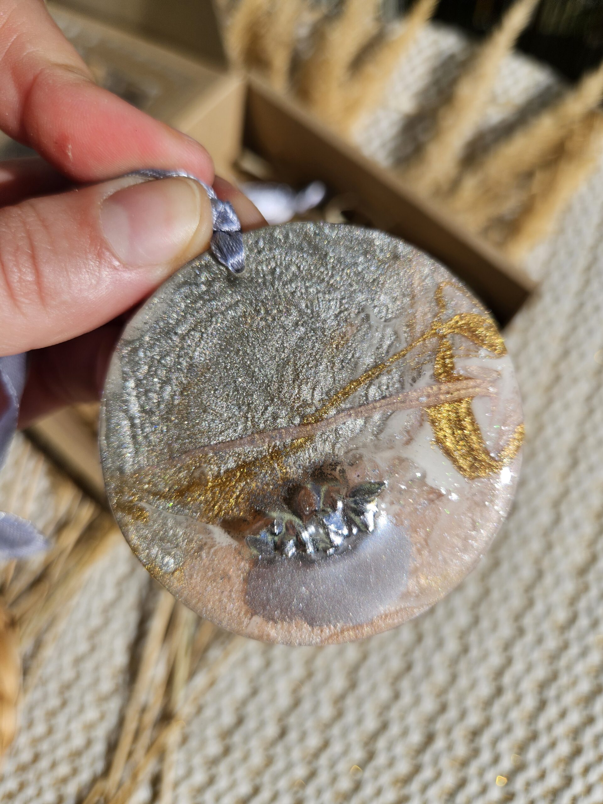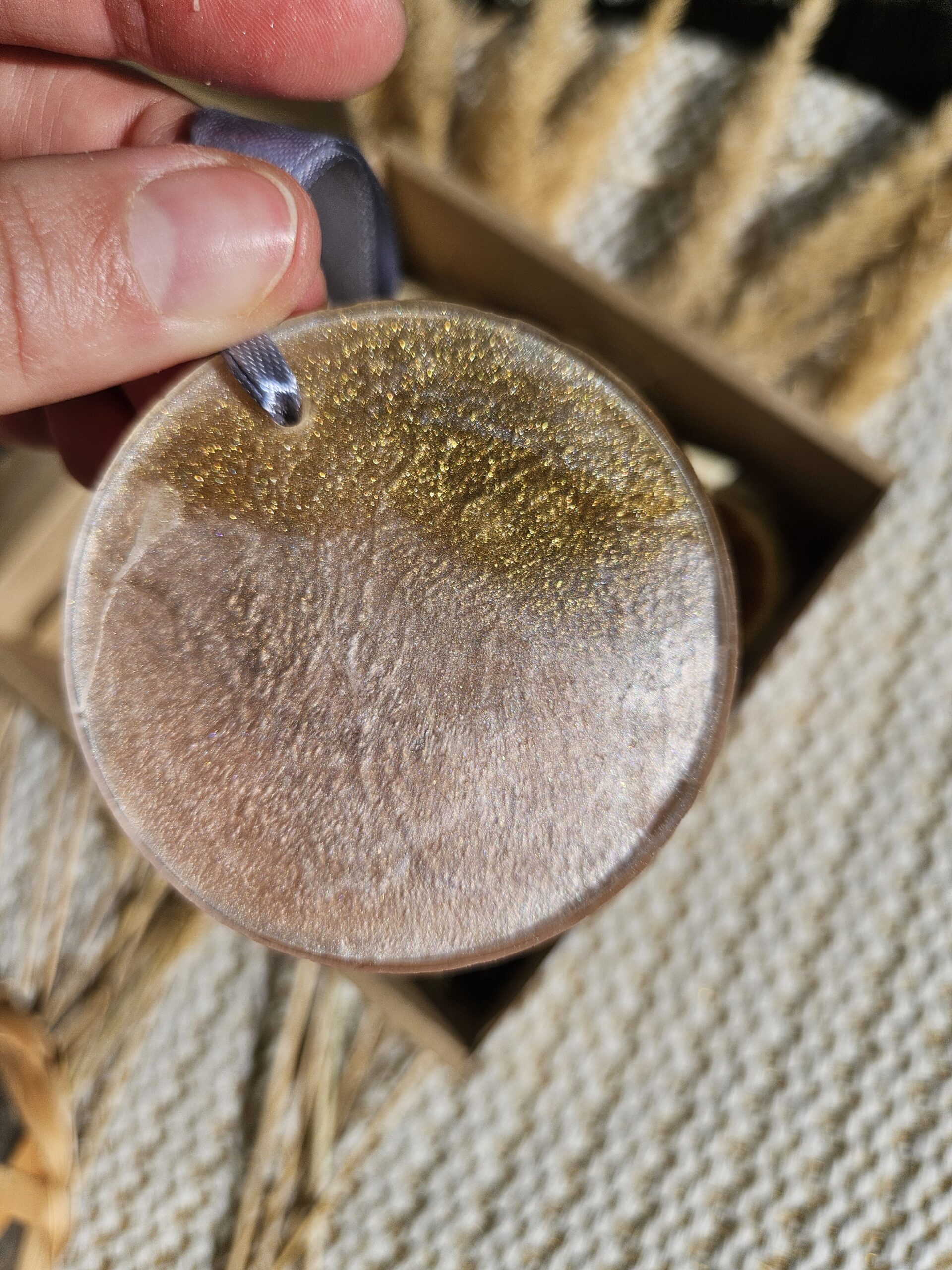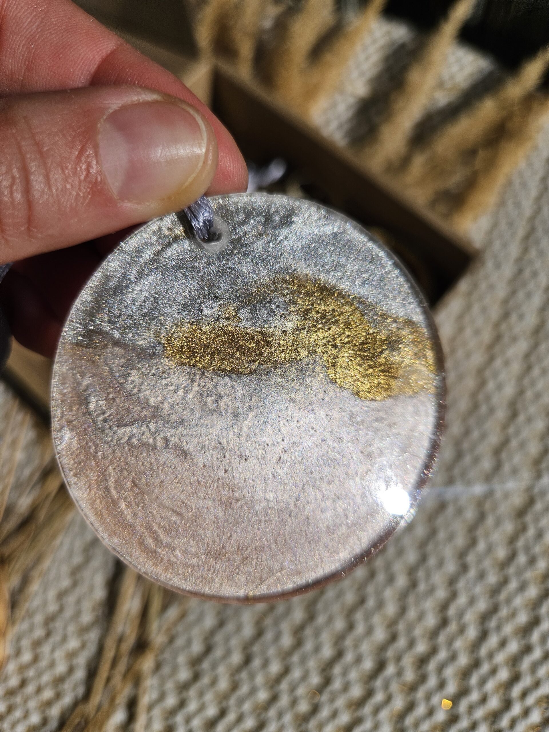 Cześć, dzień dobry! Przedstawiam Ci ręcznie wykonane zawieszki, które wniosą do Twojego domu magię i odrobinę świątecznego blasku. Zawieszki wykonane są z żywicy, która pięknie się mieni – w tej wersji w odcieniach różu, bieli, srebra i złota, zawieszone na srebrnej wstążce.