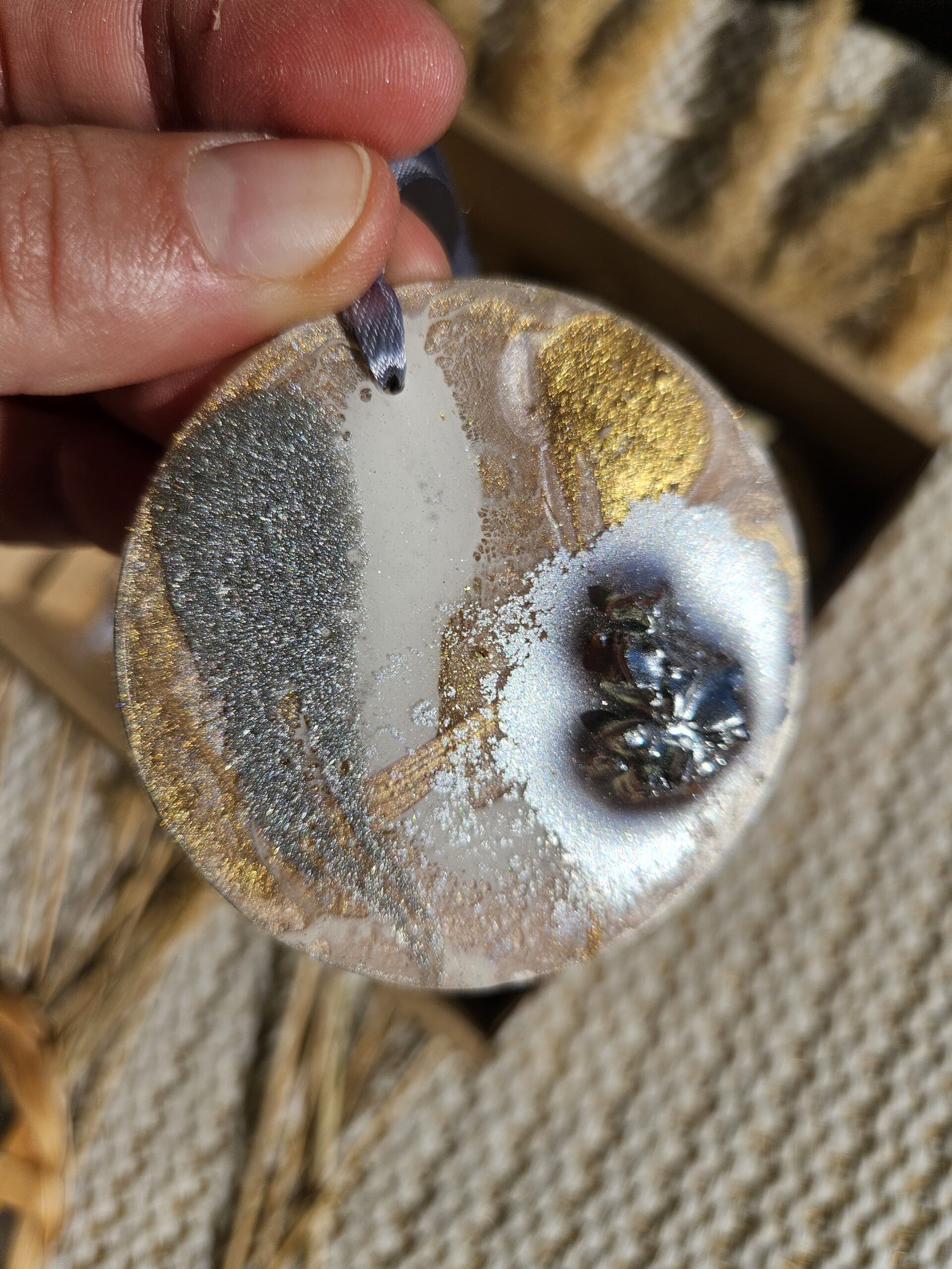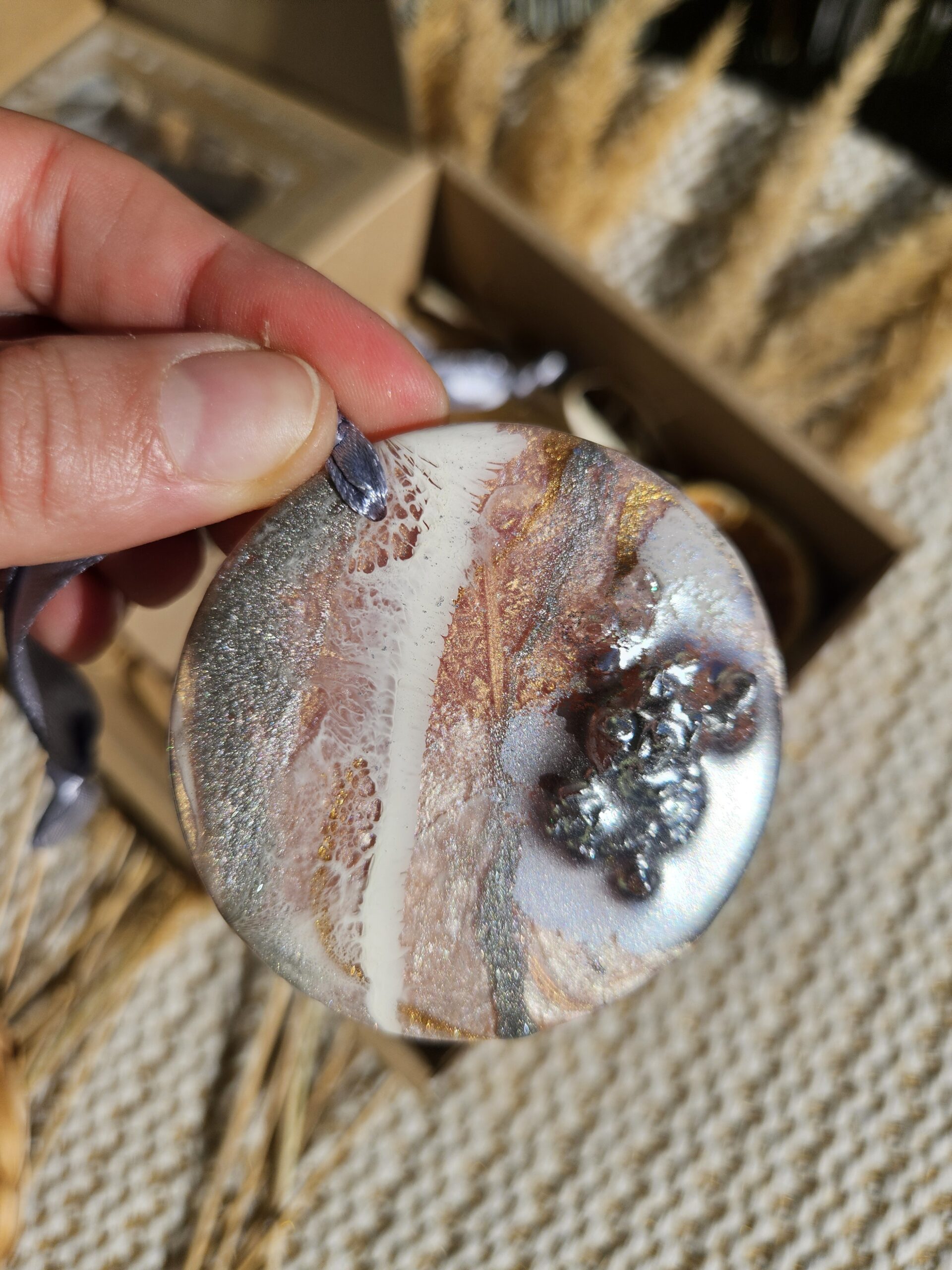 Dodaj wyjątkowego klimatu do swojego świątecznego wnętrza dzięki tym zawieszkom – będą one nie tylko piękną, ale również oryginalną dekoracją. Każda zawieszka jest inna i niepowtarzalna dzięki żywicy i pigmentom, które za każdym razem układają się w inny wzór.