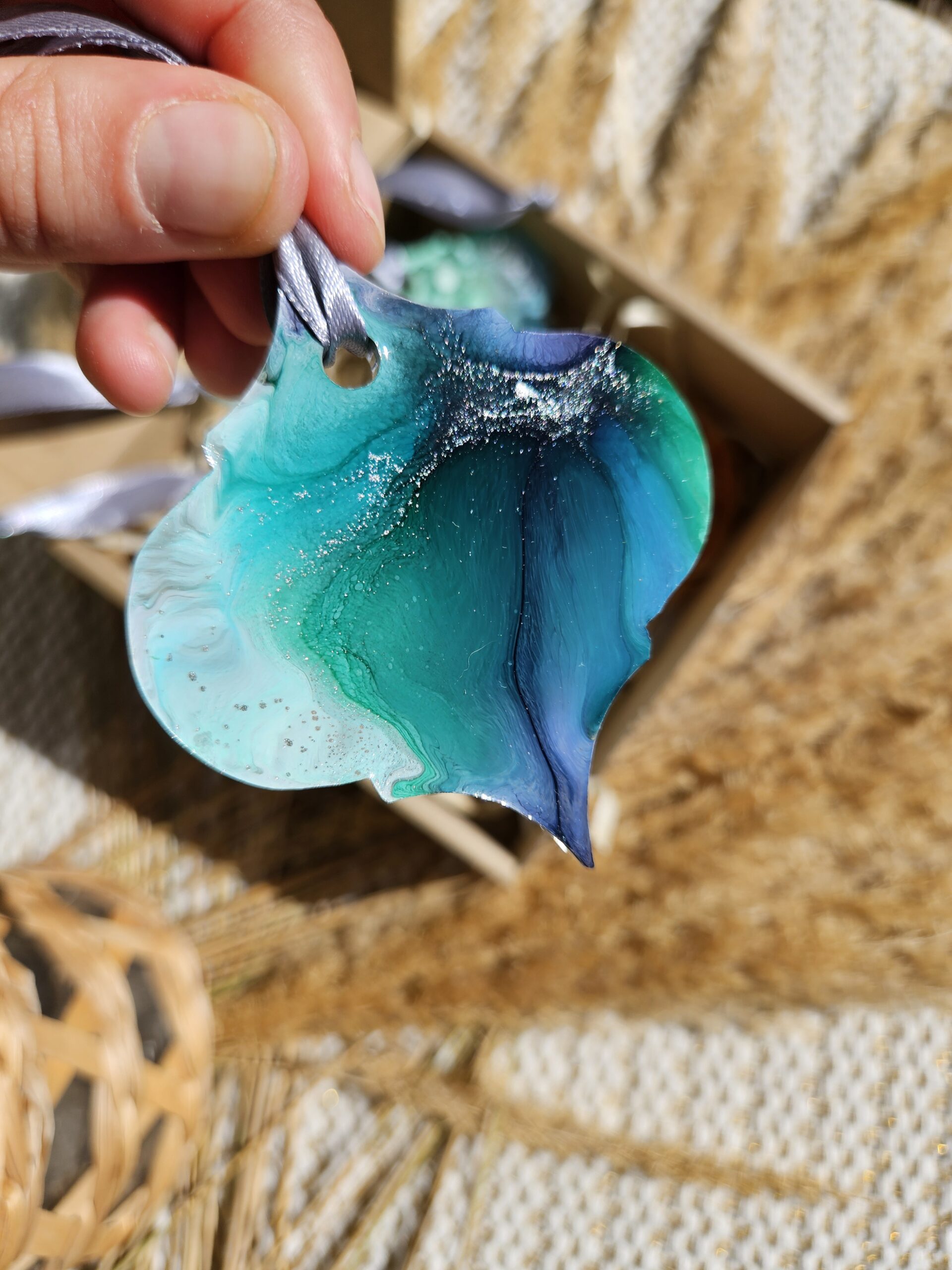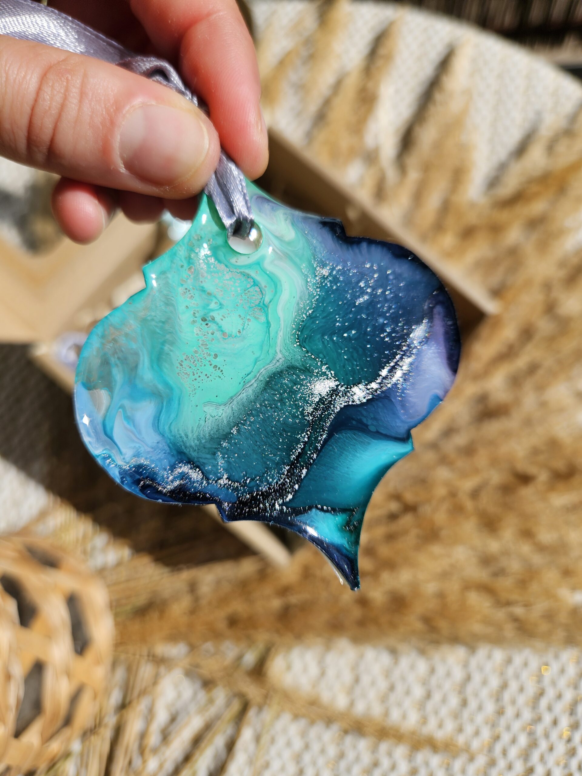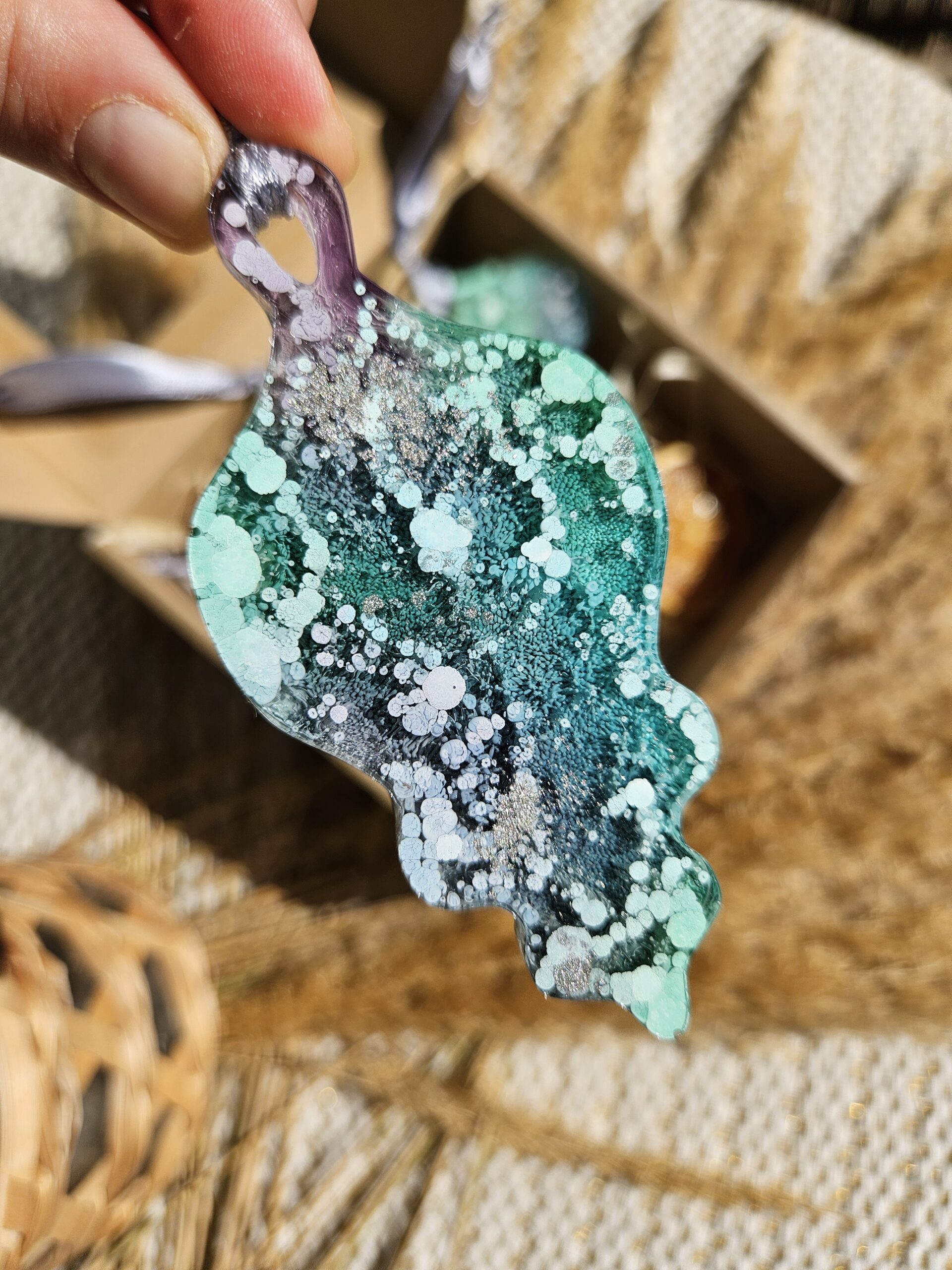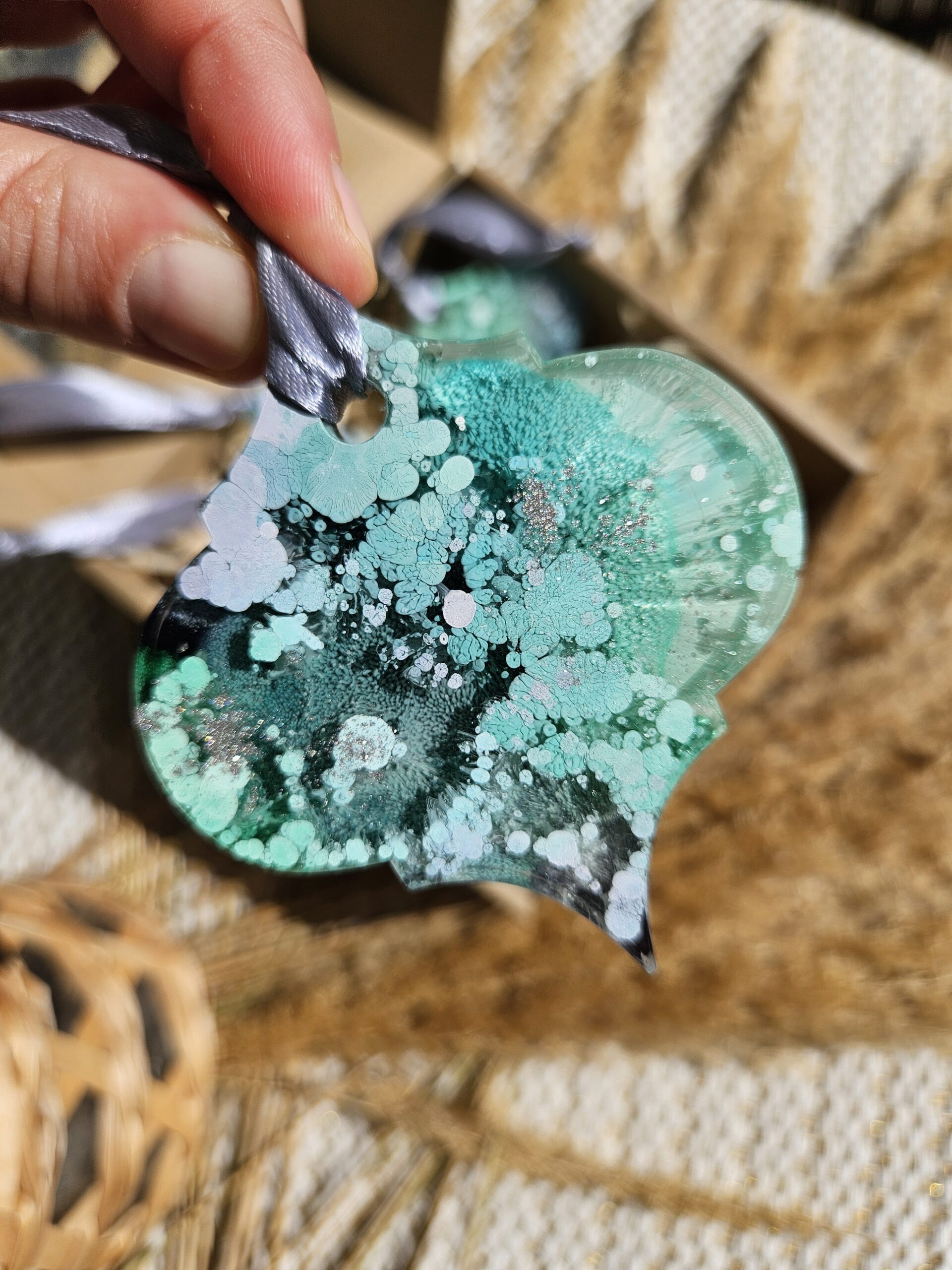 Cześć, dzień dobry! Przedstawiam Ci ręcznie wykonane zawieszki, które wniosą do Twojego domu magię i odrobinę świątecznego blasku. Zawieszki wykonane są z żywicy, która pięknie się mieni – w tej wersji w odcieniach turkusu, granatu, bieli i srebra, zawieszone na srebrnej wstążce.
