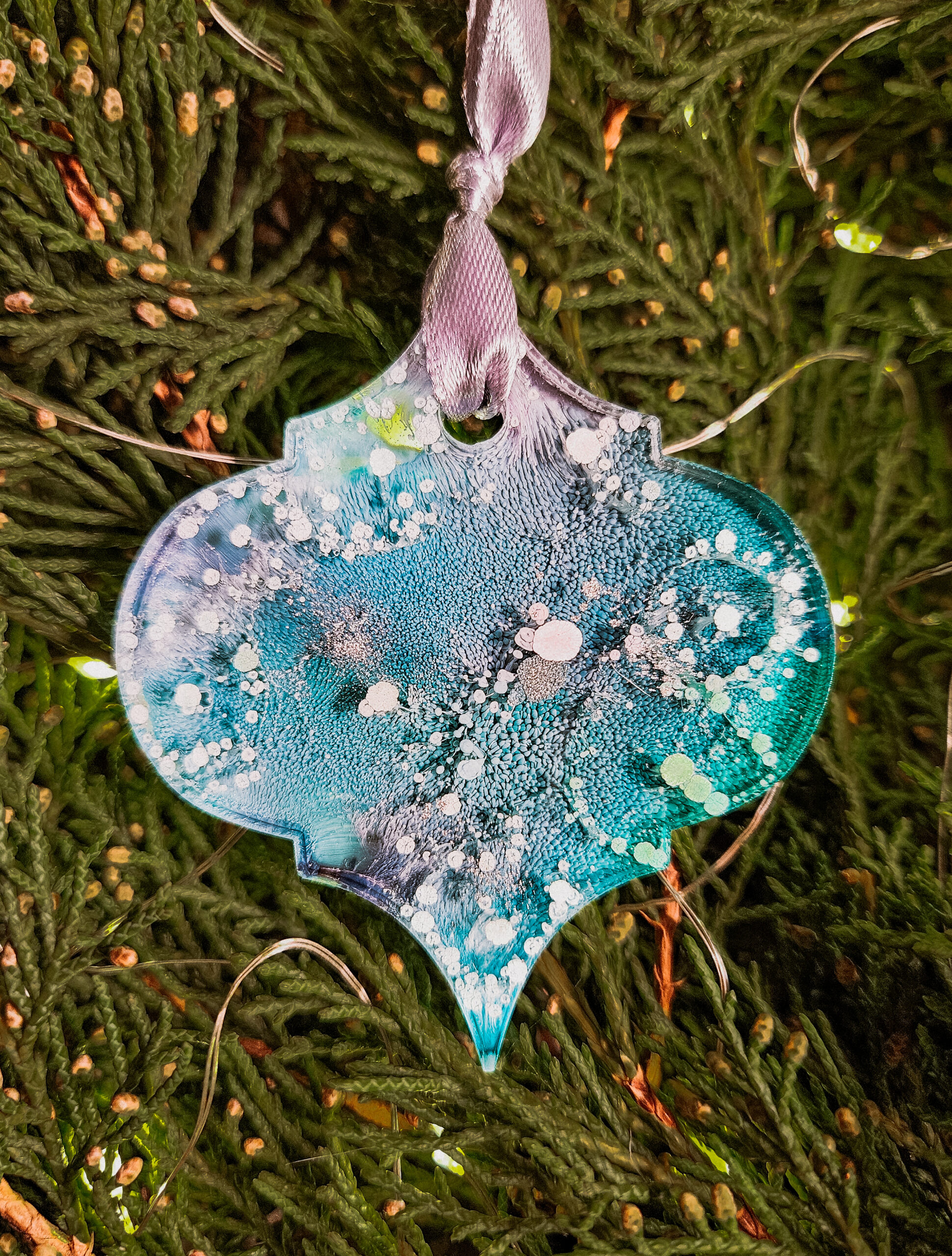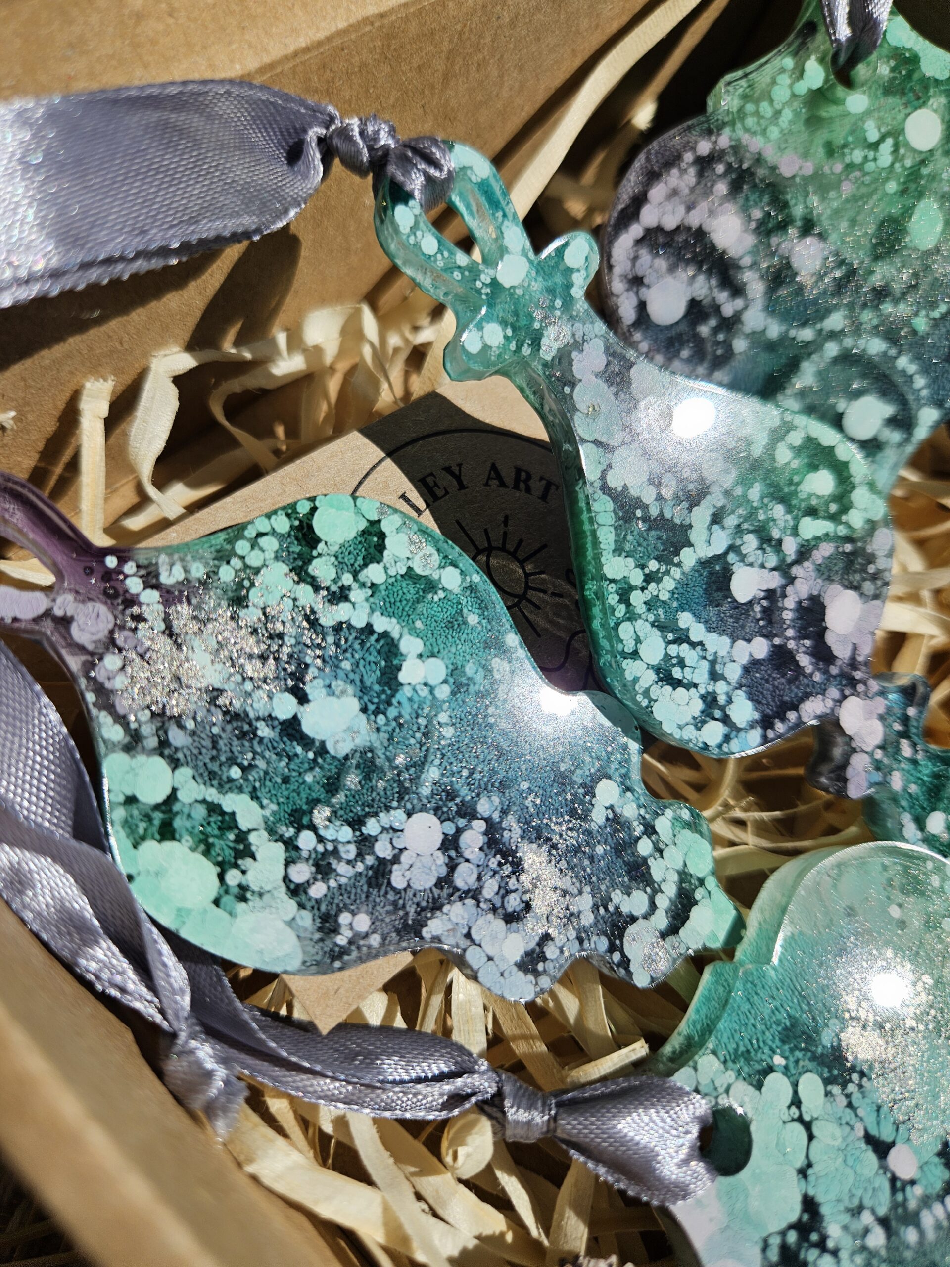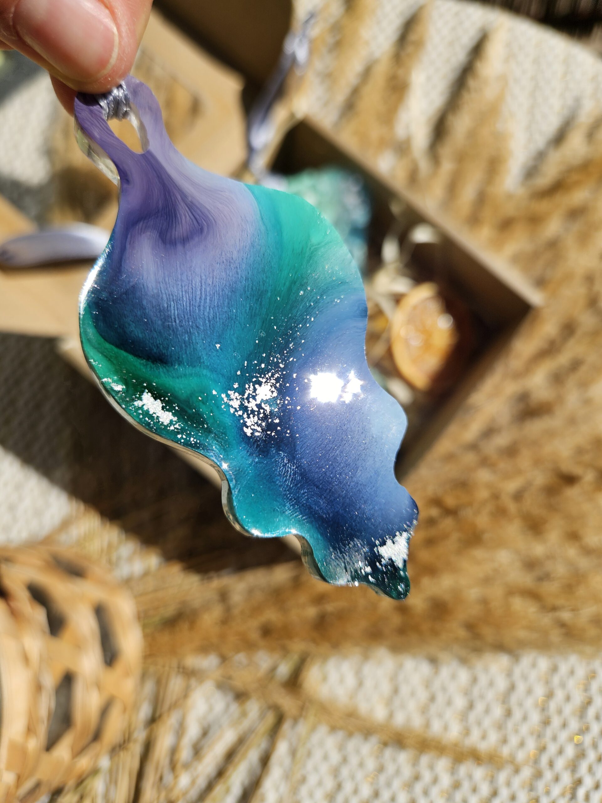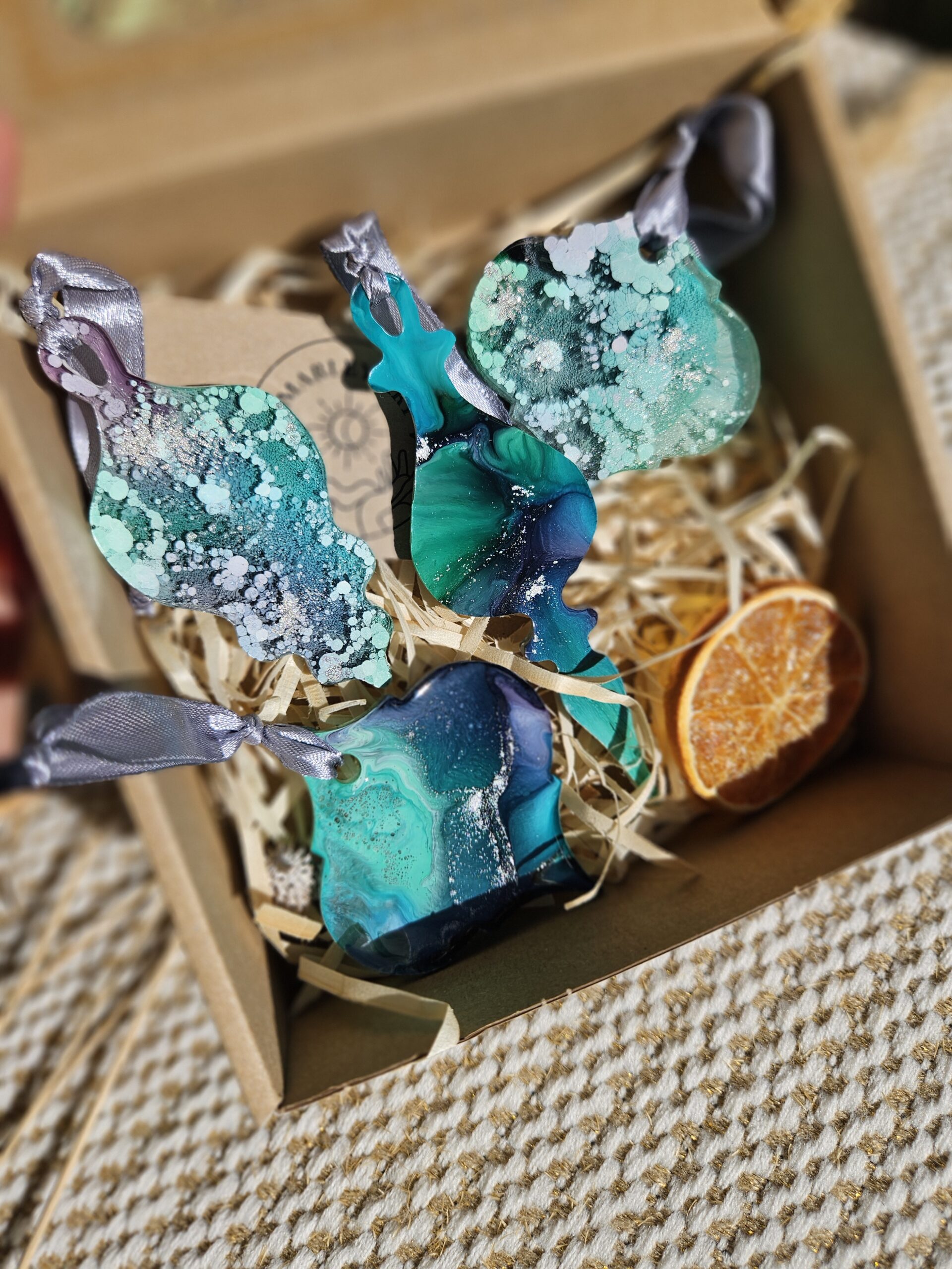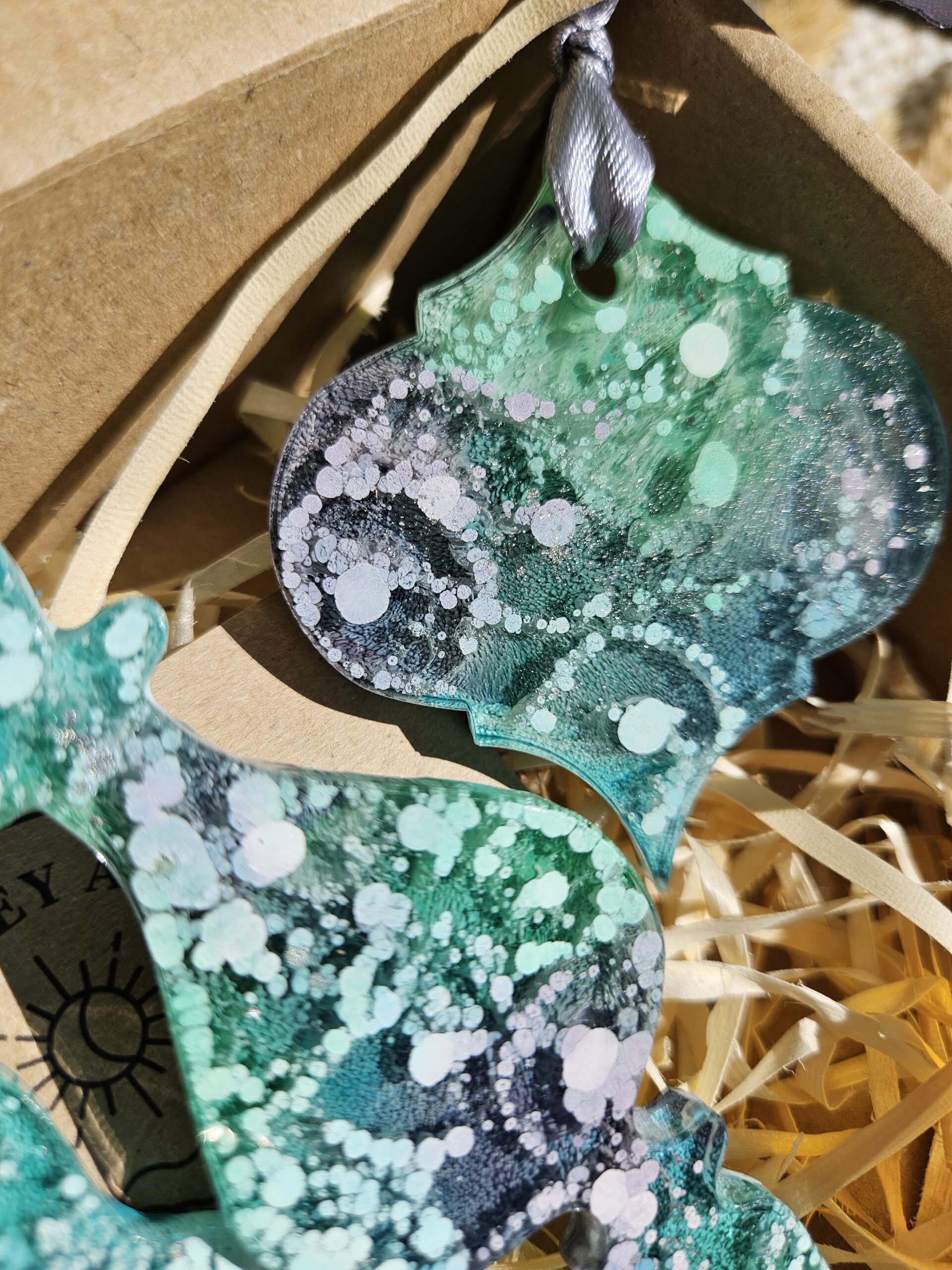 Cześć, dzień dobry! Przedstawiam Ci ręcznie wykonane zawieszki, które wniosą do Twojego domu magię i odrobinę świątecznego blasku. Zawieszki wykonane są z żywicy, która pięknie się mieni – w tej wersji w odcieniach turkusu, granatu, bieli i srebra, zawieszone na srebrnej wstążce.