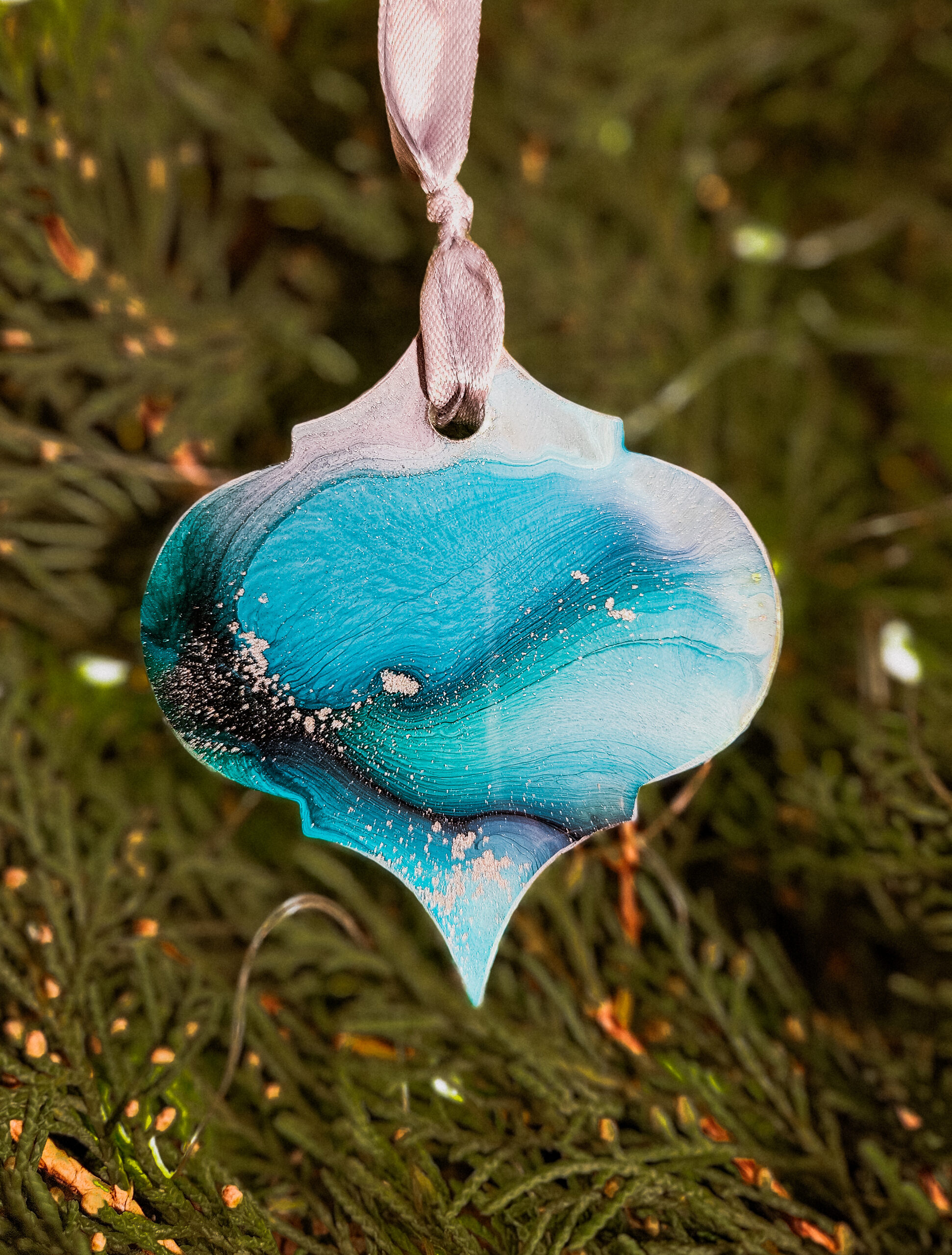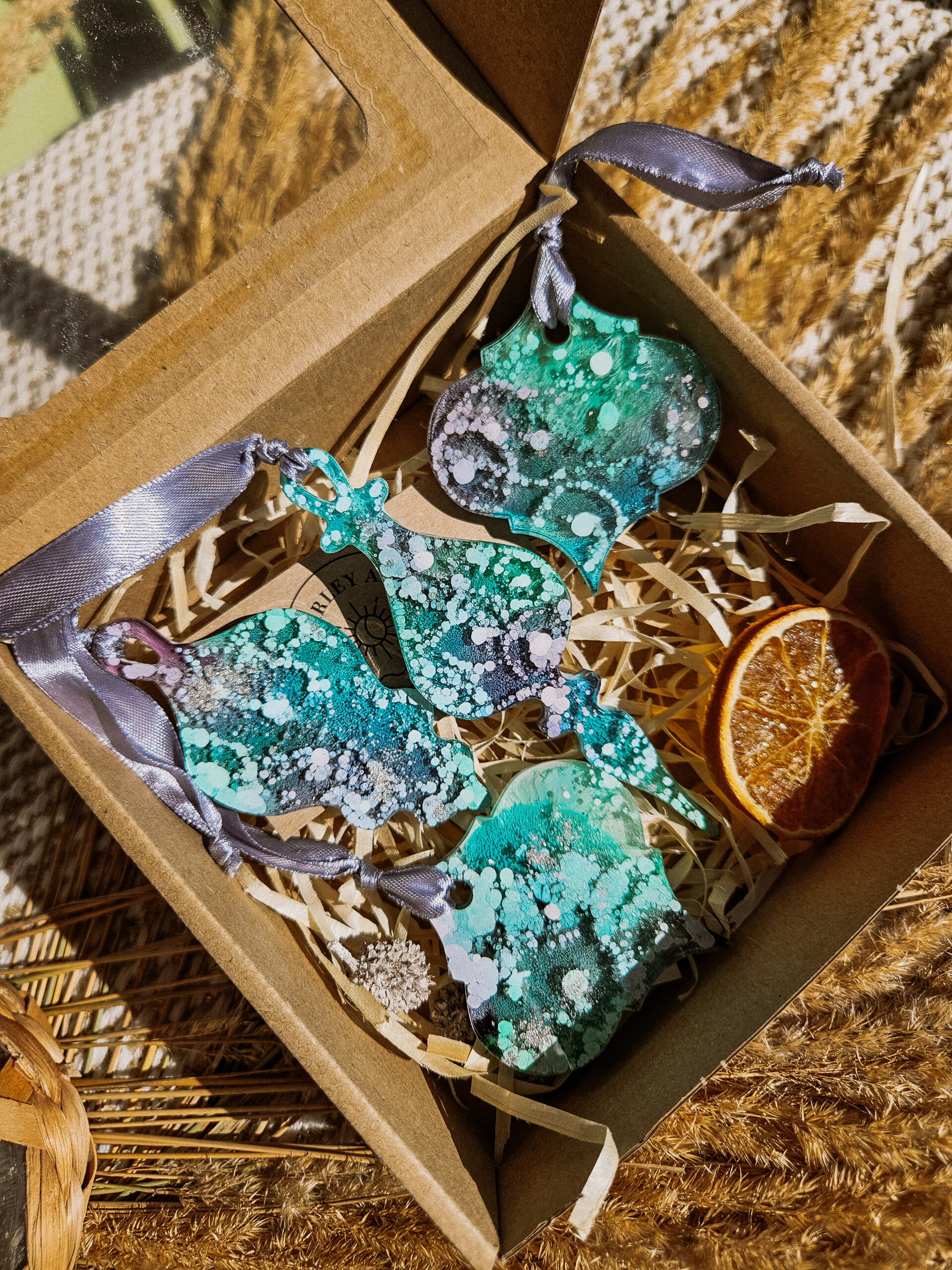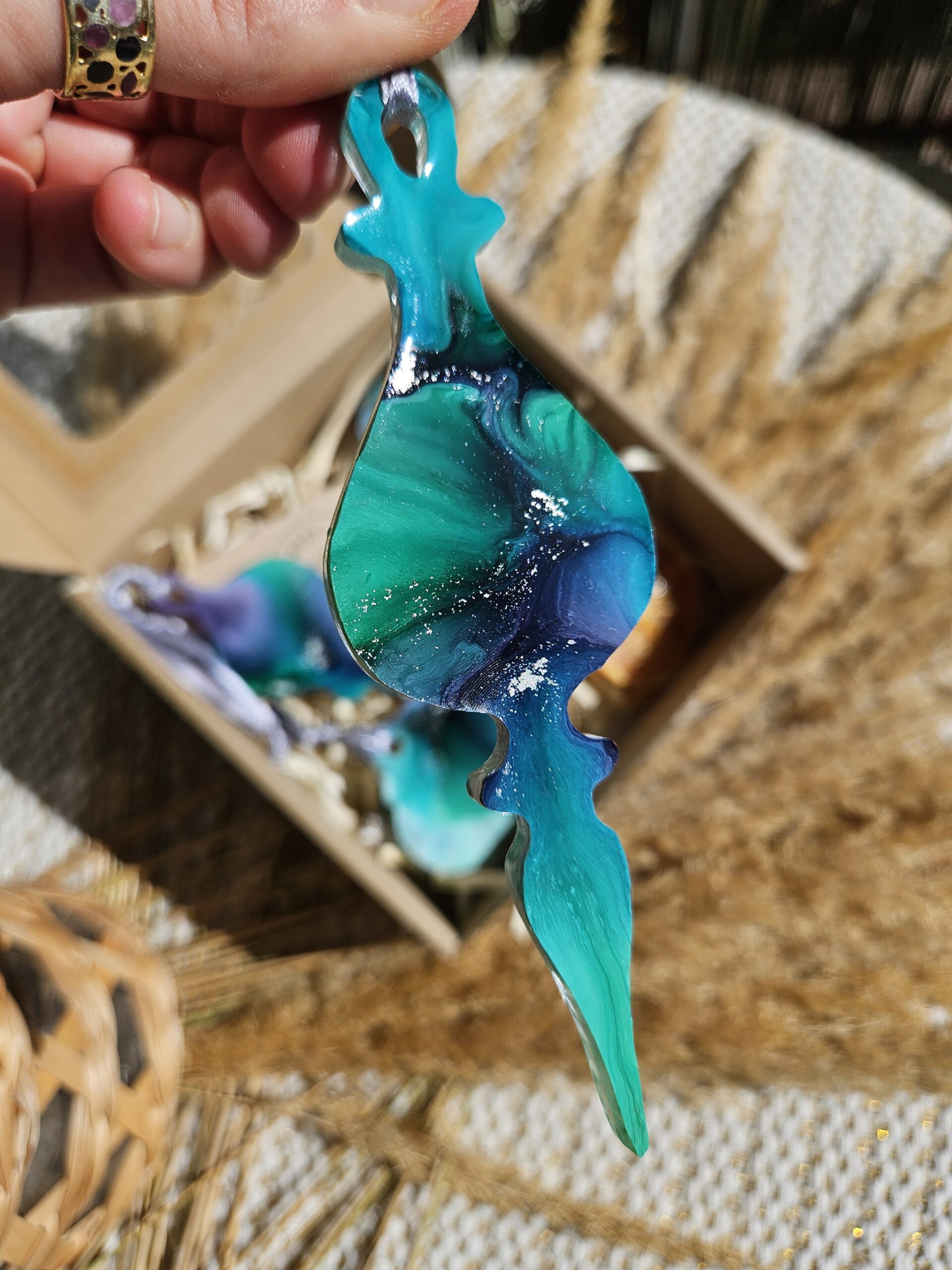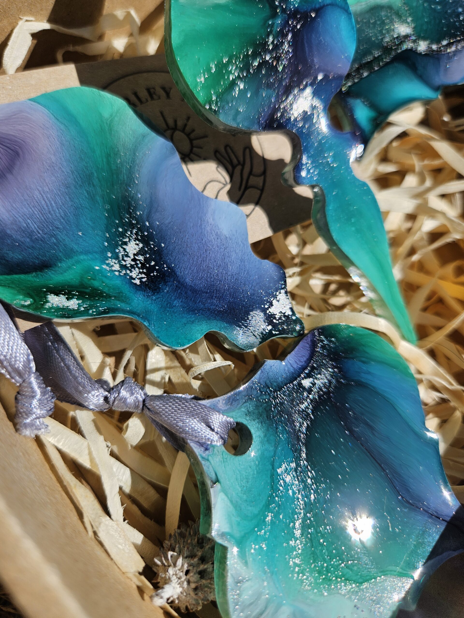 Cześć, dzień dobry! Przedstawiam Ci ręcznie wykonane zawieszki, które wniosą do Twojego domu magię i odrobinę świątecznego blasku. Zawieszki wykonane są z żywicy, która pięknie się mieni – w tej wersji w odcieniach turkusu, granatu, bieli i srebra, zawieszone na srebrnej wstążce.