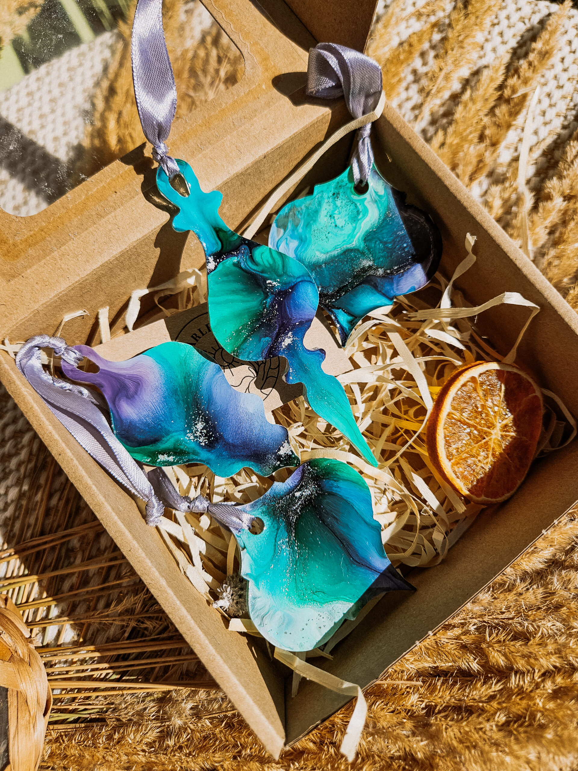 Zawieszki pakuję w ozdobne pudełka, dzięki czemu idealnie sprawdzą się jako prezent dla bliskiej osoby, która docenia piękno i unikatowość rękodzieła.
